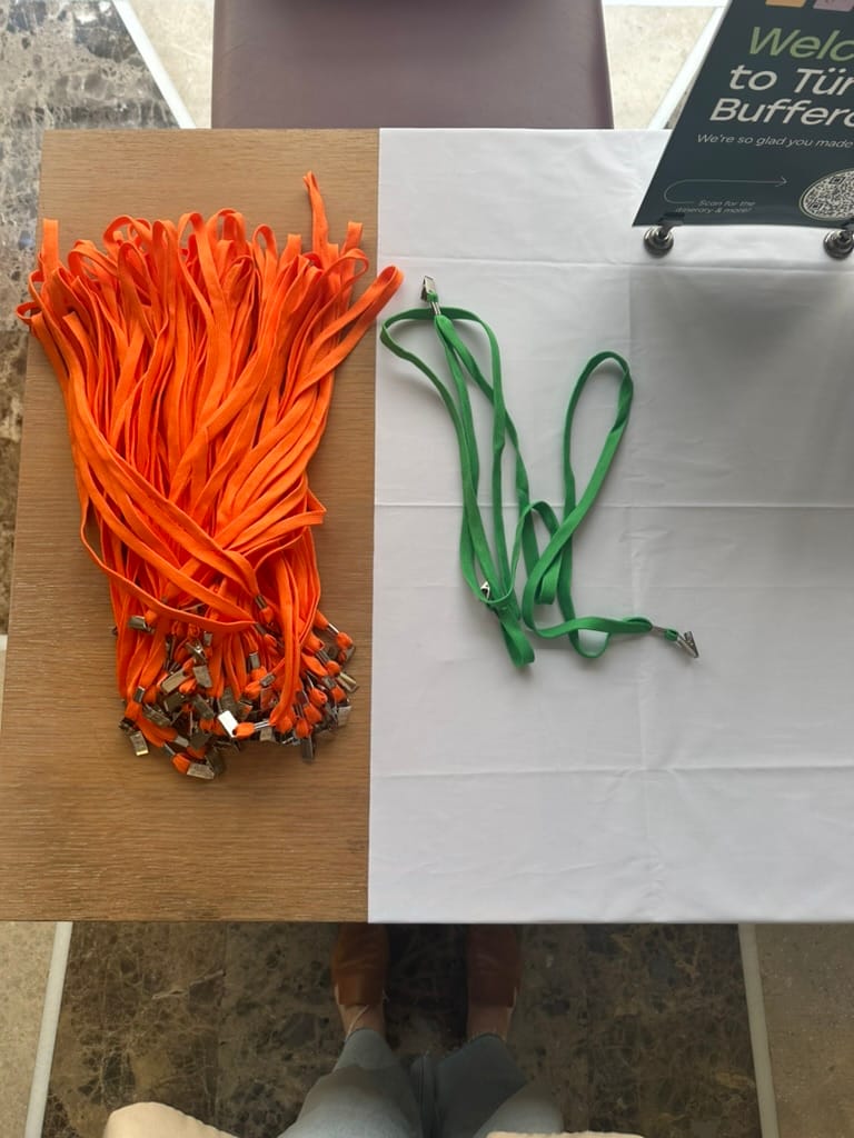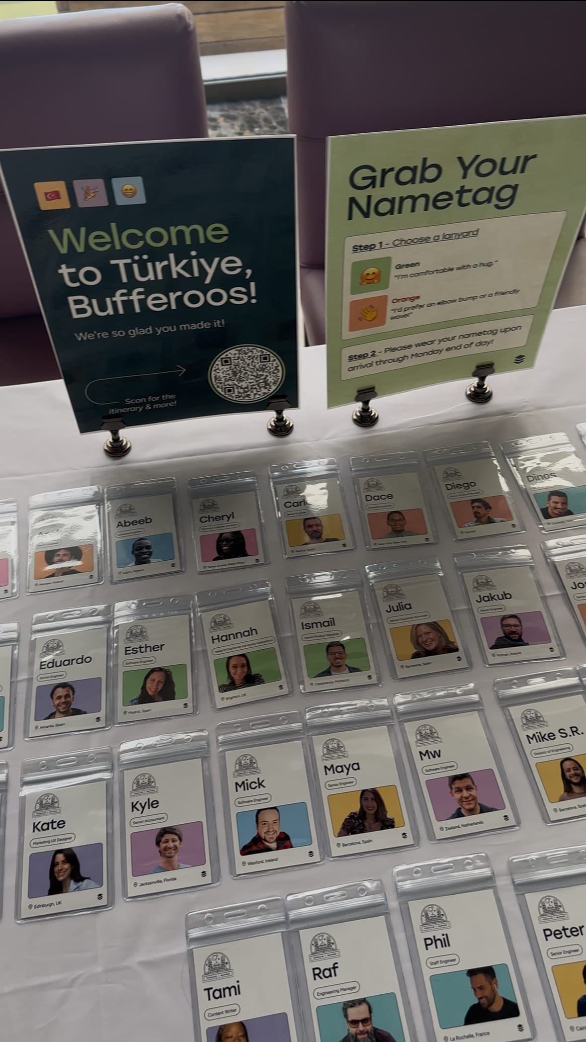 - Welcome table with nametags + colored lanyards: Our talented design team always helps us shine here (and trust us, you don't want to see the version we tried to DIY). As teammates arrive throughout the day, we love having a welcome table set up with a cute sign, a QR code for the Retreat agenda, and personalized nametags waiting for each teammate. For the past few years, we've added colored lanyards too: green means “I’m cool with hugs,” while orange signals “let’s stick to a friendly wave or fist bump.” While it's not always perfect in practice (some folks are just natural huggers!), it's a thoughtful nudge that respects comfort levels and helps keep everyone feeling safe and seen.