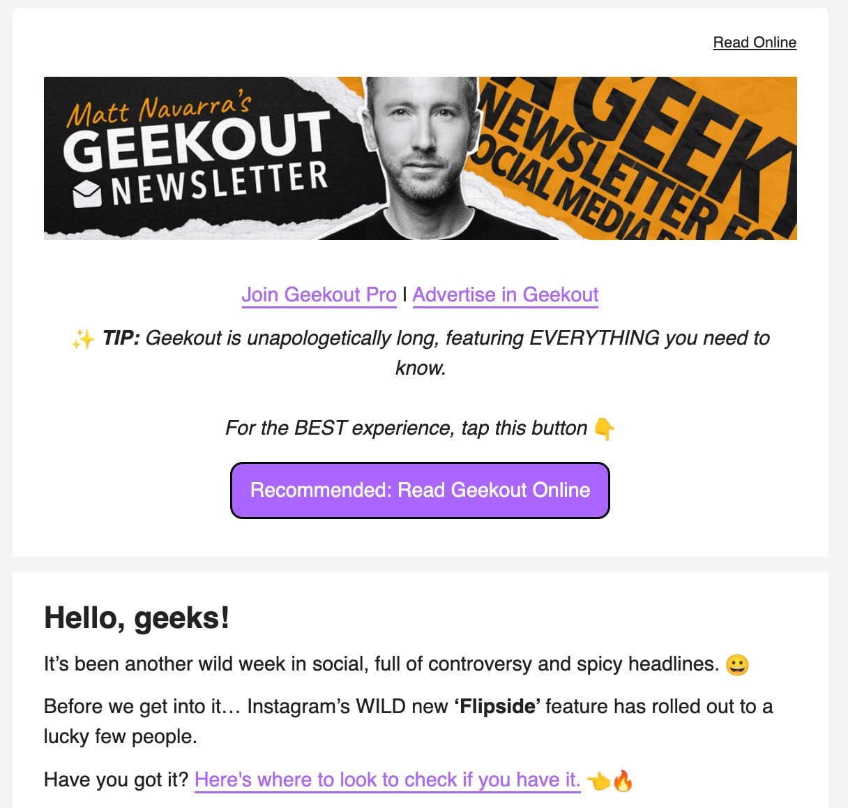 Matt Navarra is a social media personality with sharing everything happening in social media. His newsletter, Geekout, and its accompanying WhatsApp group is a great way to keep up with the constant changes in the space and connect with other social media professionals.