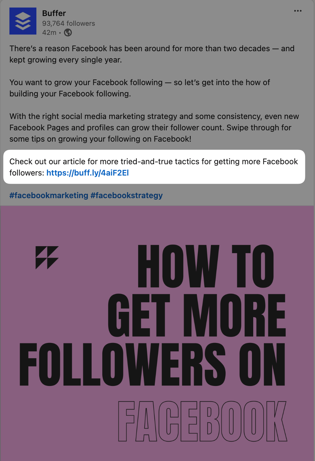 For example, we published a LinkedIn carousel post about increasing Facebook followers, which is derived from a long-form post. We added the call-to-action to read the article in full to encourage our LinkedIn audience to visit our website.