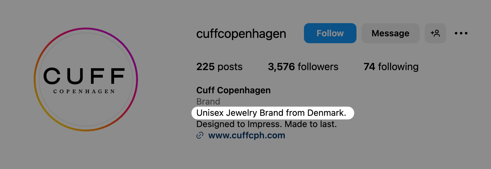 Why is this important? Someone who doesn’t know your brand might still search for niche keywords on search engines and discover you. For example, the jewelry brand Cuff Copenhagen has “Unisex Jewelry Brand from Denmark” written in its Instagram bio, which is full of relevant keywords like “jewelry brand” and “jewelry brand from Denmark,” to name a few.