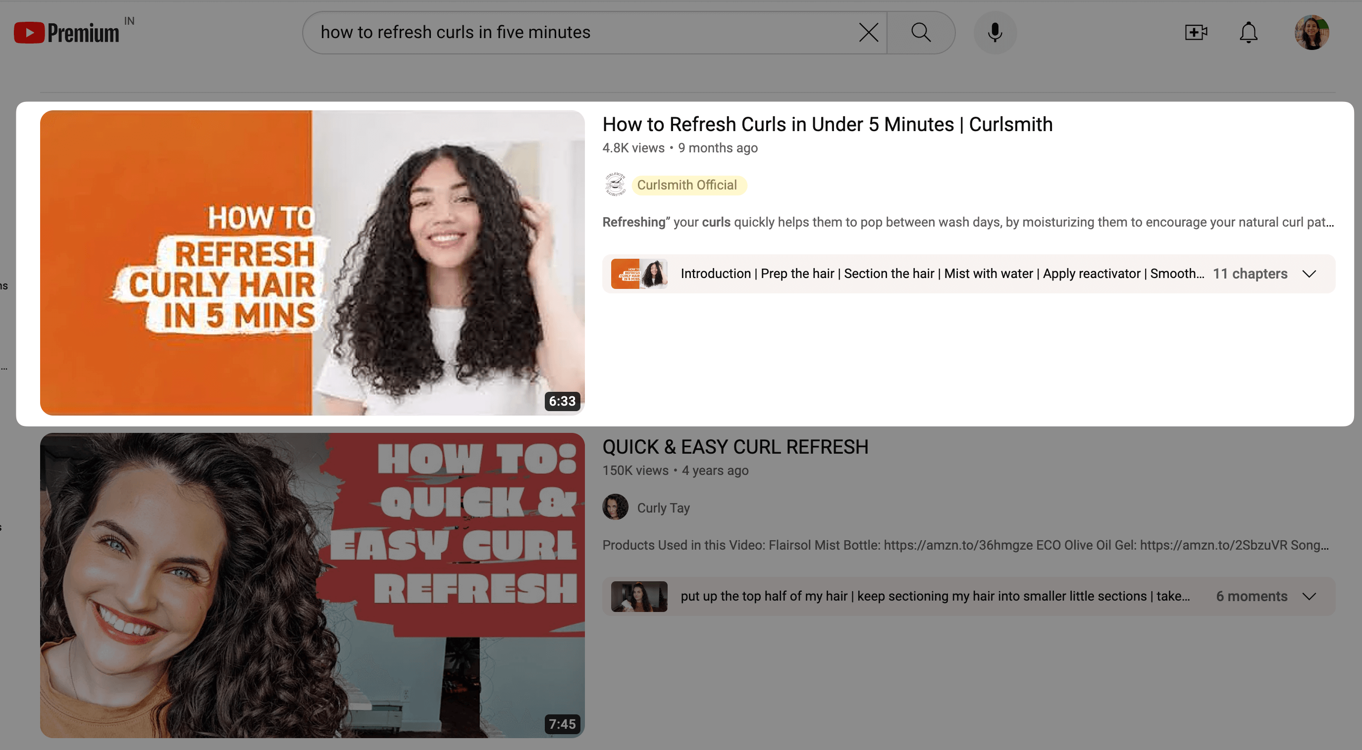 - Improving the visibility of your individual social media posts for the social media platforms’ search engines. Each social media network has a search bar — although it’s not as advanced as the search engines of Google, Bing, Tor, etc. Optimizing your social media content with relevant keywords ensures that your posts appear at the top when your target audience searches for their questions. For example, Curlsmith’s video comes up in the top ten results when I search for “how to refresh curls in five minutes” on YouTube.