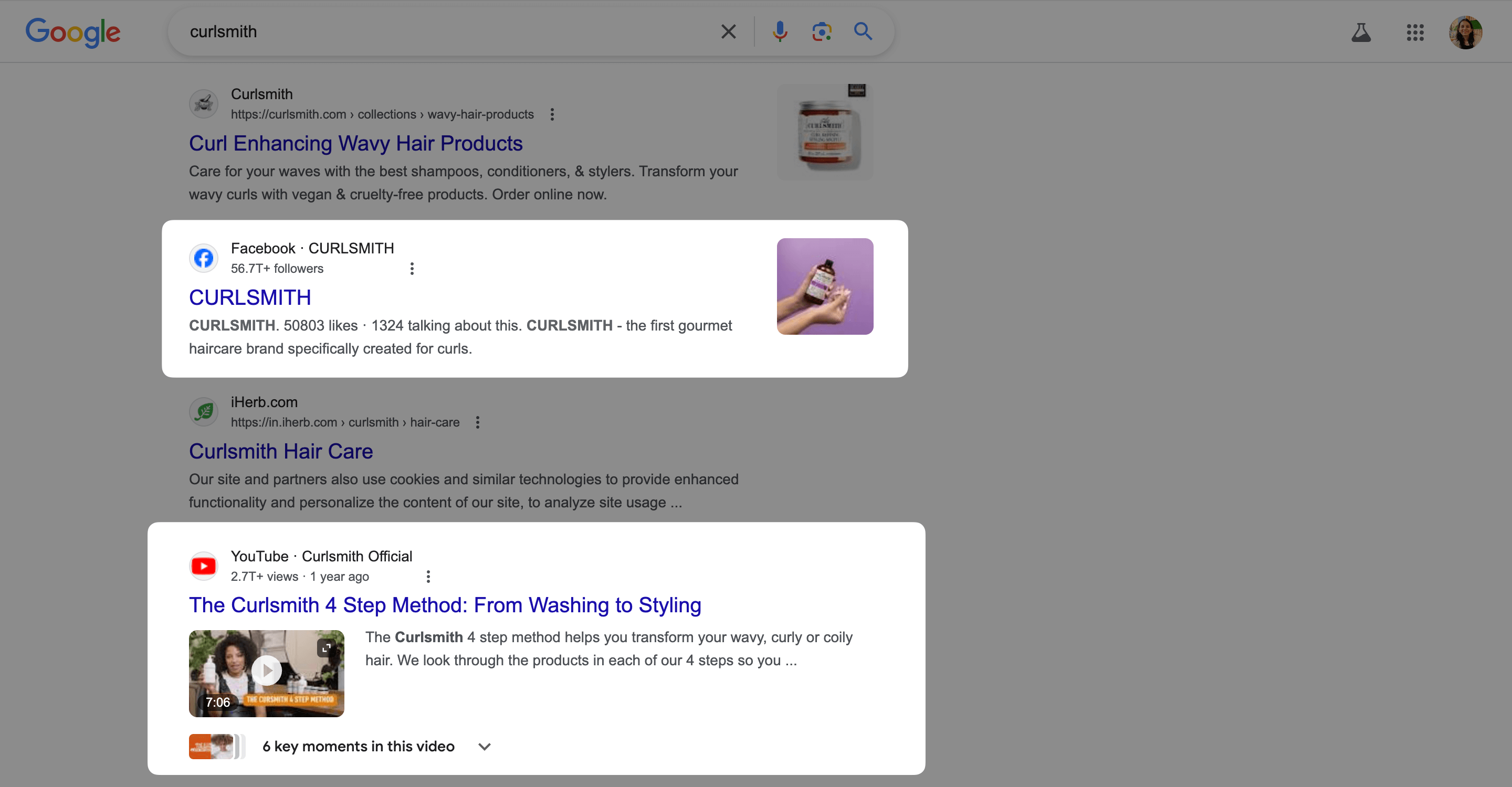 - Improving your brand’s visibility using your social media profiles on search engines like Google and Bing. This is especially true for branded keywords like your brand’s name. For example, when you search for Curlsmith on Google, its Instagram account, YouTube channel, and Facebook Page also appear on the first page of results.