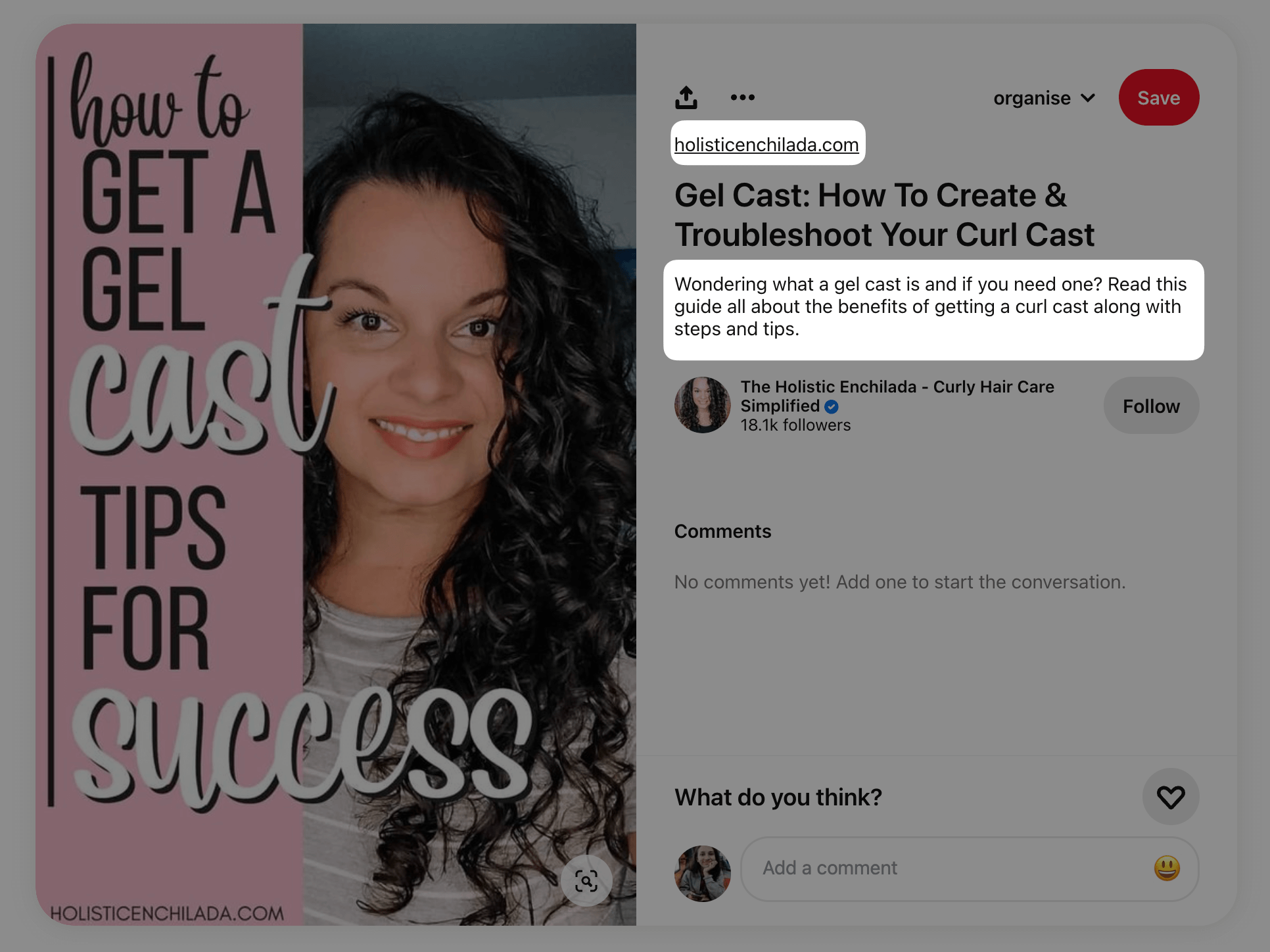- Using social SEO will drive traffic to your website. Search engines typically don’t use social signals to impact the ranking of your website. This means social media SEO doesn’t directly impact your rankings in platforms like Google (it does in Bing, though). But you can use social SEO to increase traffic by redirecting your audience on social to your website by repurposing your content for social media. For example, if I search for “curly hair gel cast” on Pinterest, one of the top posts by creator Delilah Orpi redirects the users to her blog on the topic.