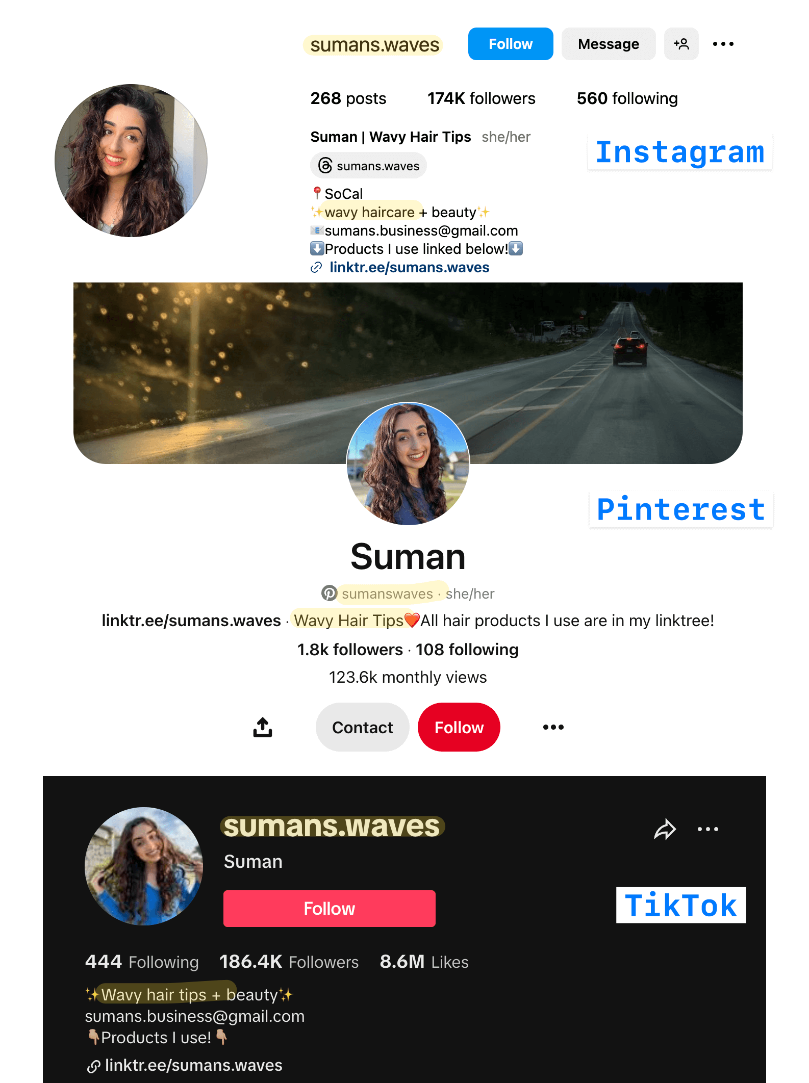 For example, creator Suman has “wavy hair tips” and “products linked” that are consistent across all her social media bios. All platforms — Instagram, TikTok, and Pinterest — also have the same username and a clear image of her as the profile image.