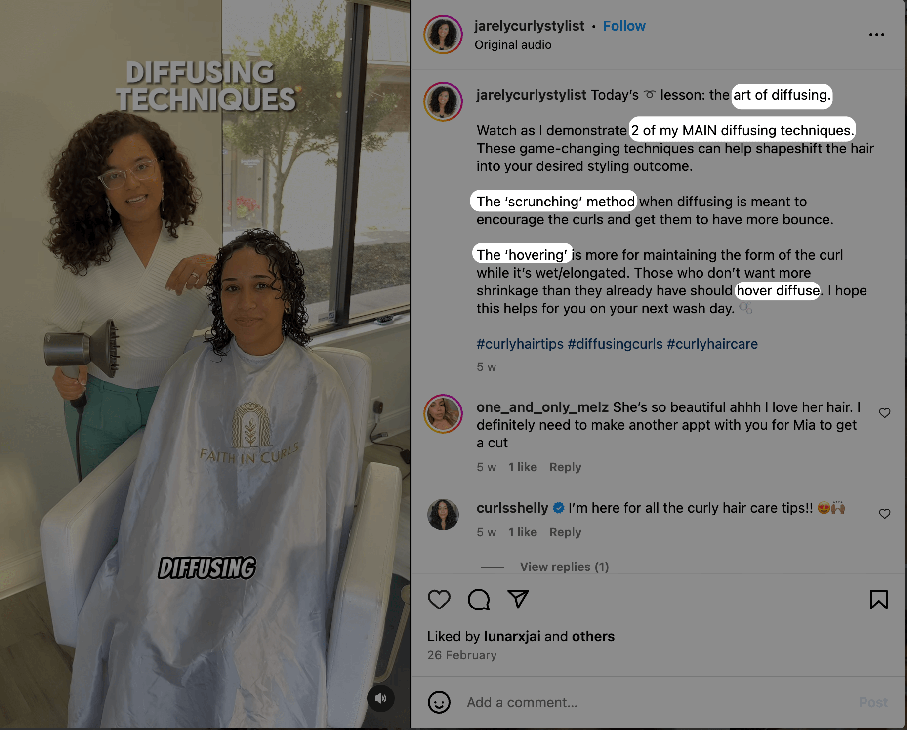 Search engines within almost all social media platforms use captions to understand what your post is about. Creating relevant content isn’t enough. Use the right keywords to help social search engines gather info about your post. For example, this Instagram post by curly hair stylist and creator Jarely Jones hits all the right keywords for “diffusing techniques” in the caption.
