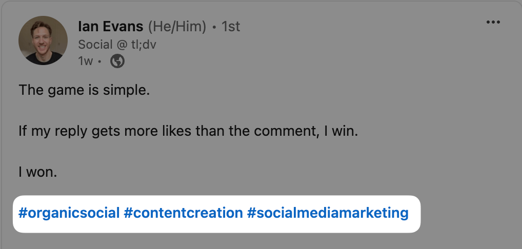 Add a mix of both popular and niche hashtags. For example, Ian Evans, creator at tl;dv adds similar hashtags regarding social media marketing and organic social media to his LinkedIn posts.