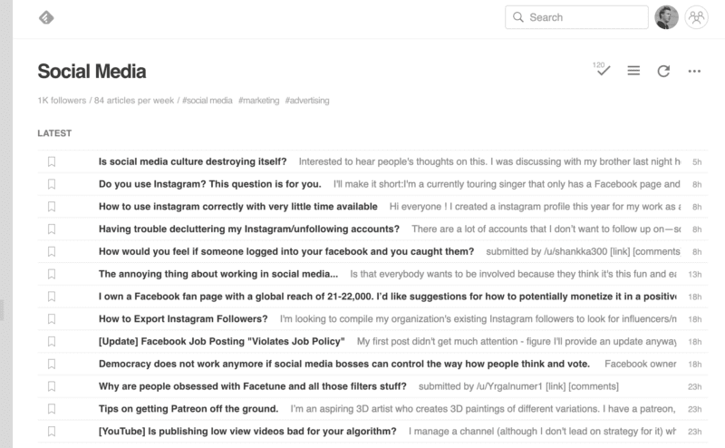 And another way that works really well if you’re doing research or content at scale is to plug your subreddits into a content aggregator like Feedly. We do this for social media content on our Buffer feeds. This will pull in all of the subreddit threads directly into Feedly where you can browse them cleanly all at once. We’ve gained a lot of insights into social media trends by following Reddit conversations over the past months.