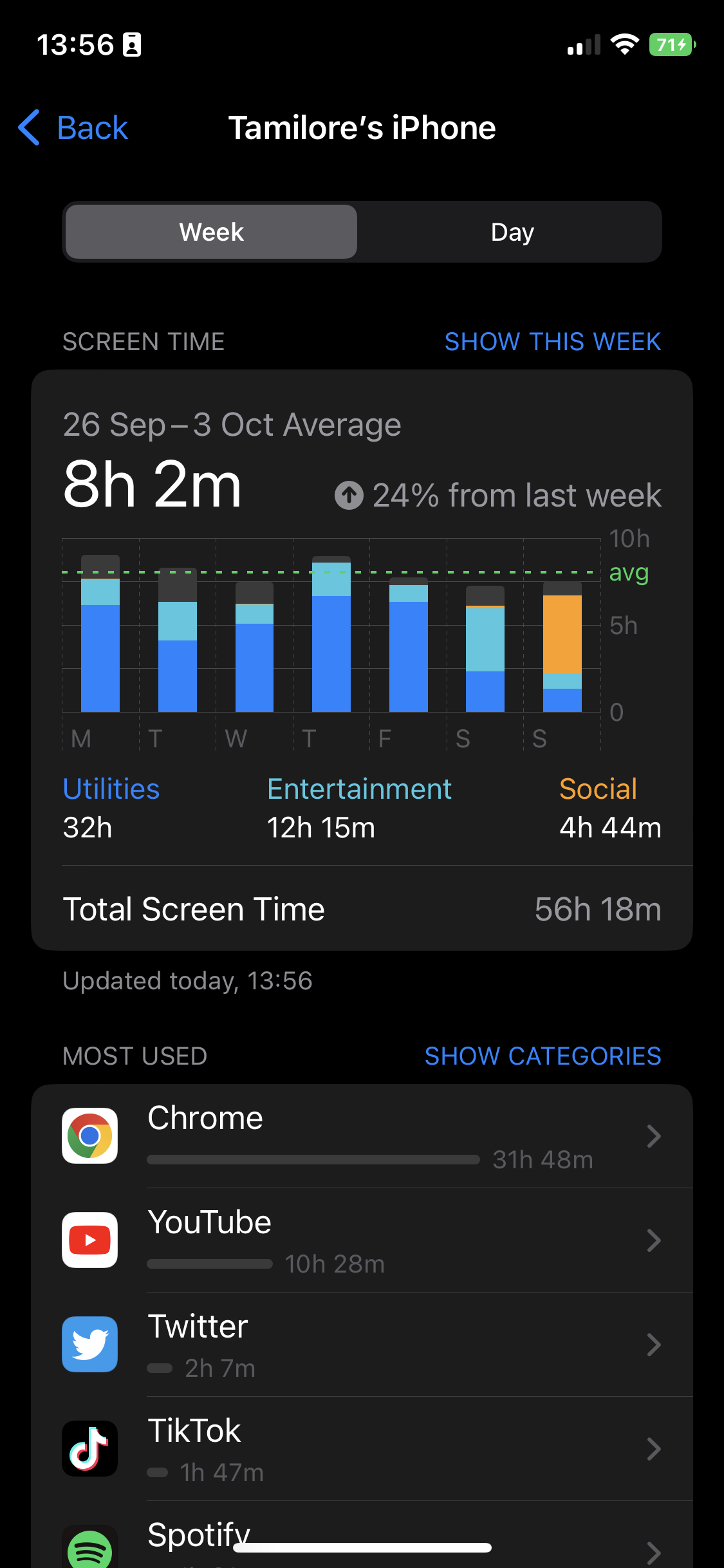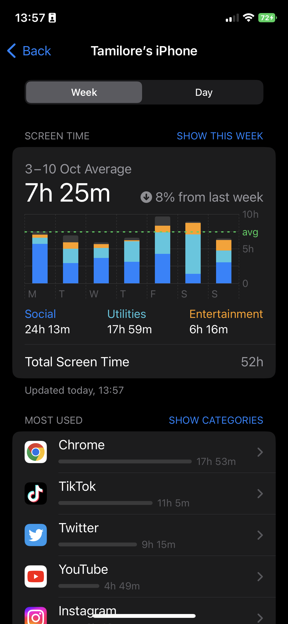 Most Used Categories: During Break Week, the time I spent on Social Media overall, even considering the times I had to redownload apps to get screenshots for articles, was WAY down. Despite the seeming drop in screen time, I reverted to my old habits once the Break was over, spending a total of 24 hours, 13 minutes (!) on social media apps the week after.