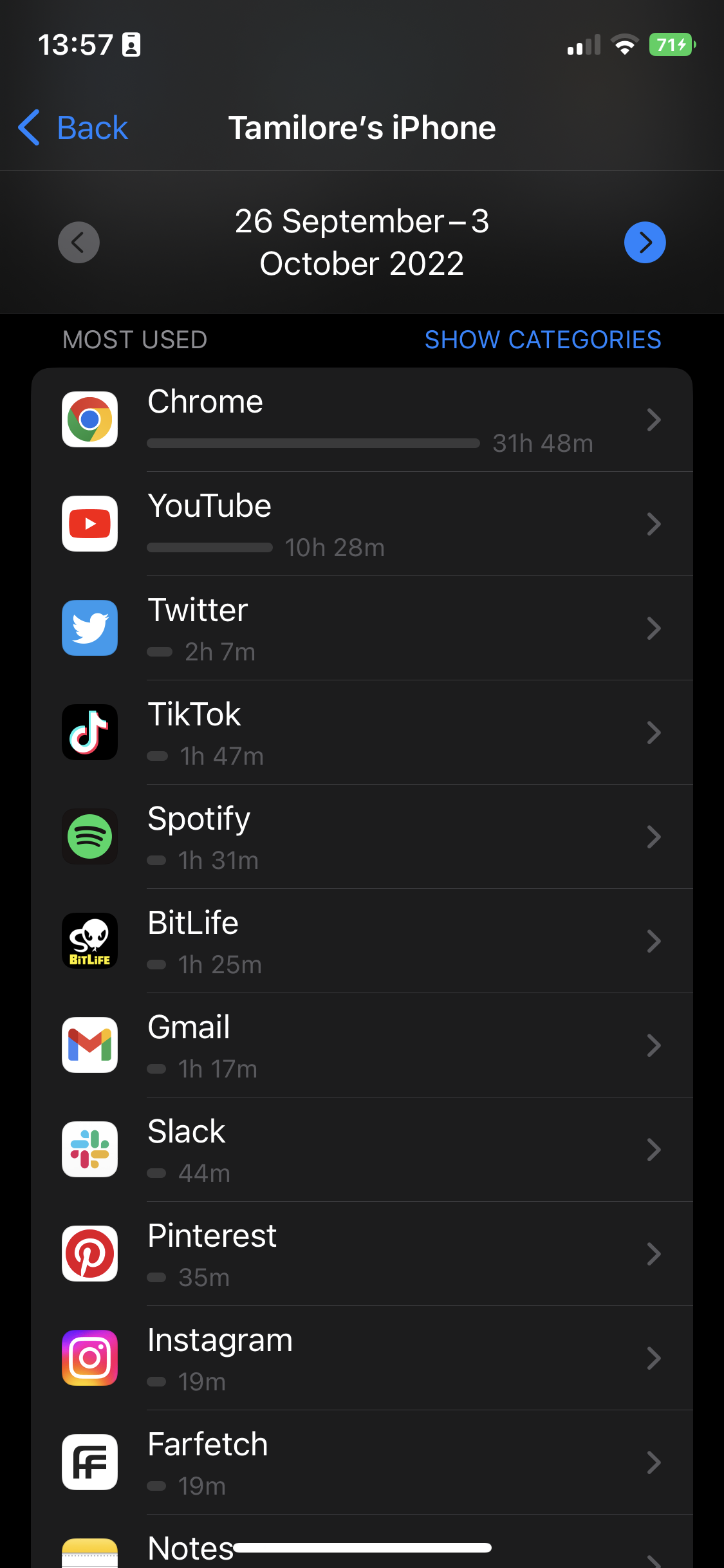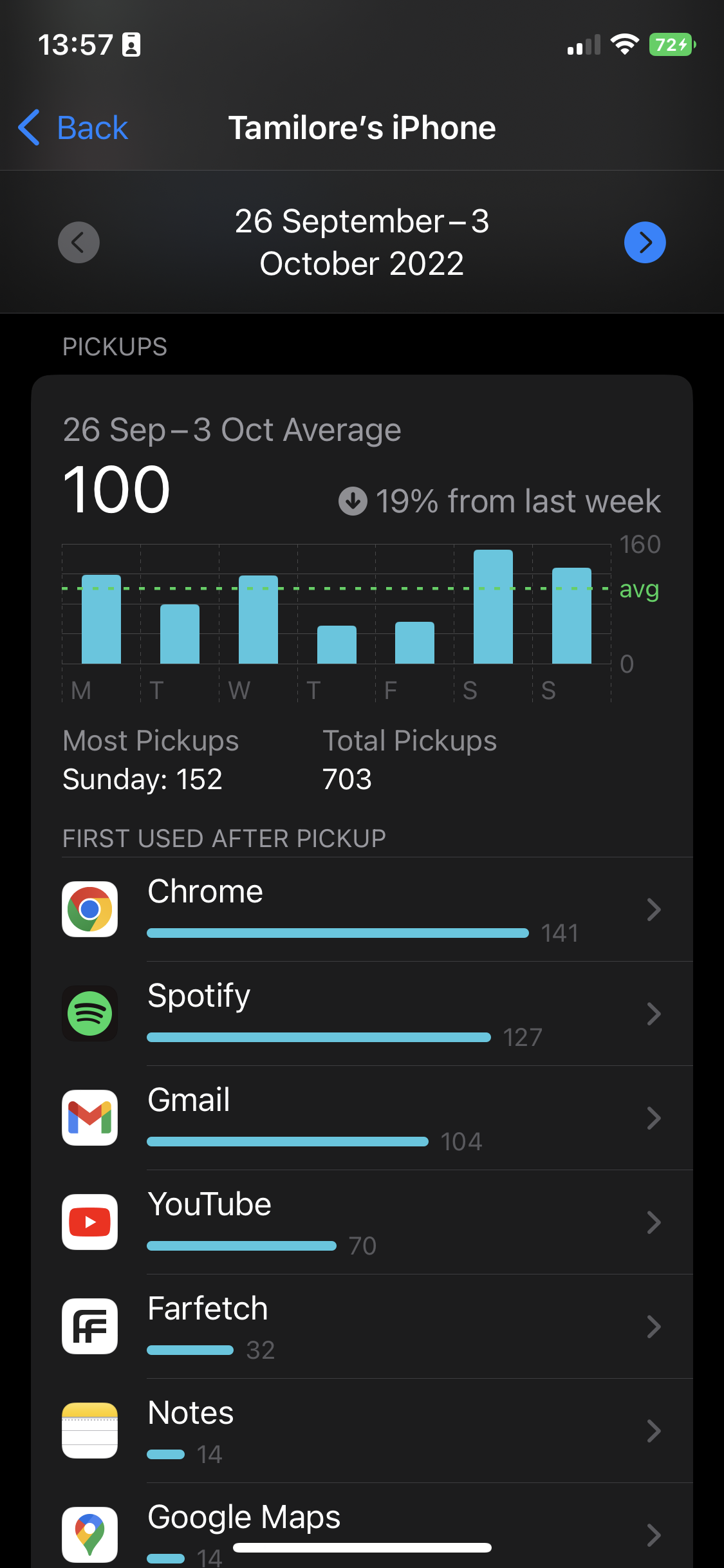 Pickups: I picked up my phone a lot more during Break Week than the week after. This is definitely because of my instinct to go for social media apps when I open my phone. I turned to my browser when I wasn’t met with my usual distractions. The difference between the two weeks is the apps I opened after picking up – Chrome was the most used during Break Week, while Twitter was my most used the week after. A funny note is the amount of time I spent on my usual shopping app, Farfetch, during Break Week – window shopping to self-soothe is very on-brand for me.