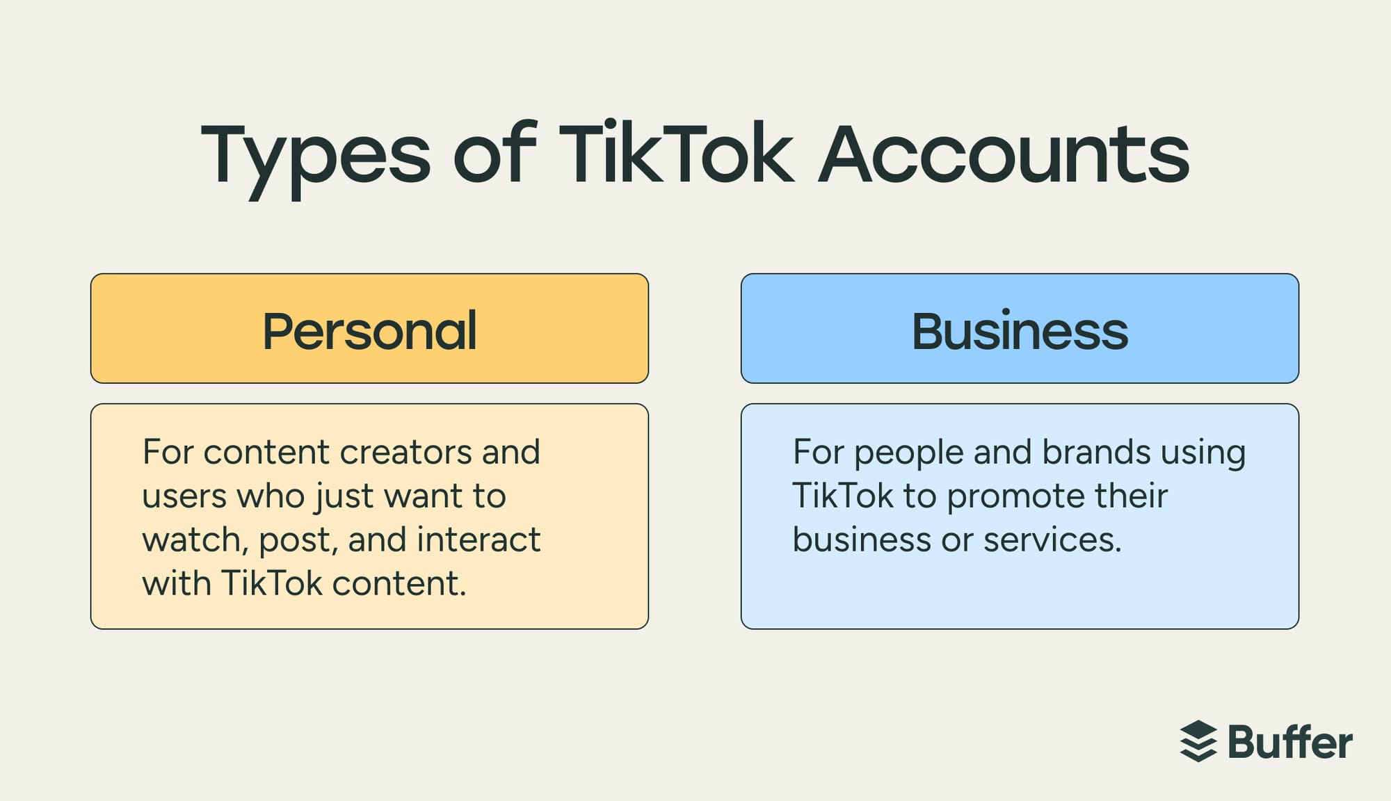- A business account is for people and brands looking to use TikTok to promote their business or services. It has access to additional features like advanced analytics, auto-replies to DMs, access to the business creative hub, and more.
