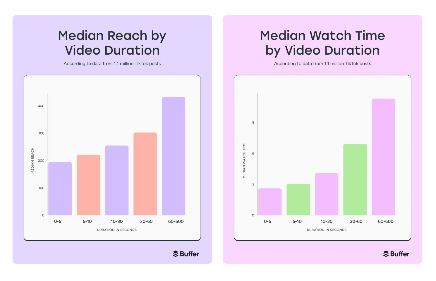 Videos you create using the TikTok app can be up to 10 minutes long, and videos you upload to TikTok can be up to 60 minutes long. So, what’s the best TikTok video length? Our research found videos longer than 60 seconds tend to get at least 43.2% more reach and 63.8% more watch time than shorter videos.