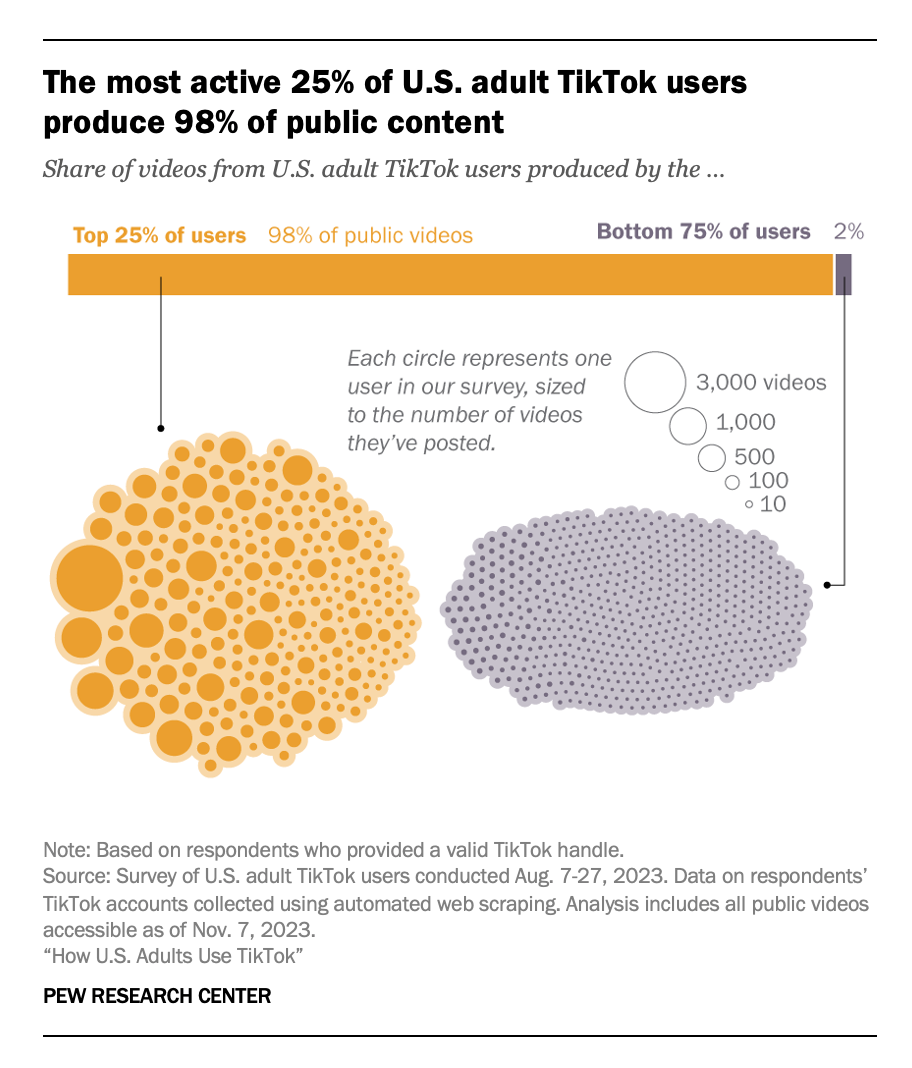 Turns out, this is a false perception. Data shows that the most active 25% of U.S. adult TikTok users produce 98% of content on the platform. That means about half of all U.S. adults on TikTok have never posted a video themselves.