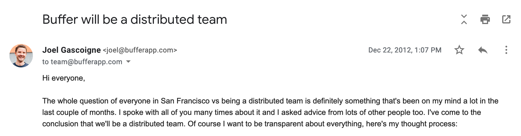 With this insight and further thinking, we became a fully distributed team. Here’s a screenshot from my email to the team sharing this news: