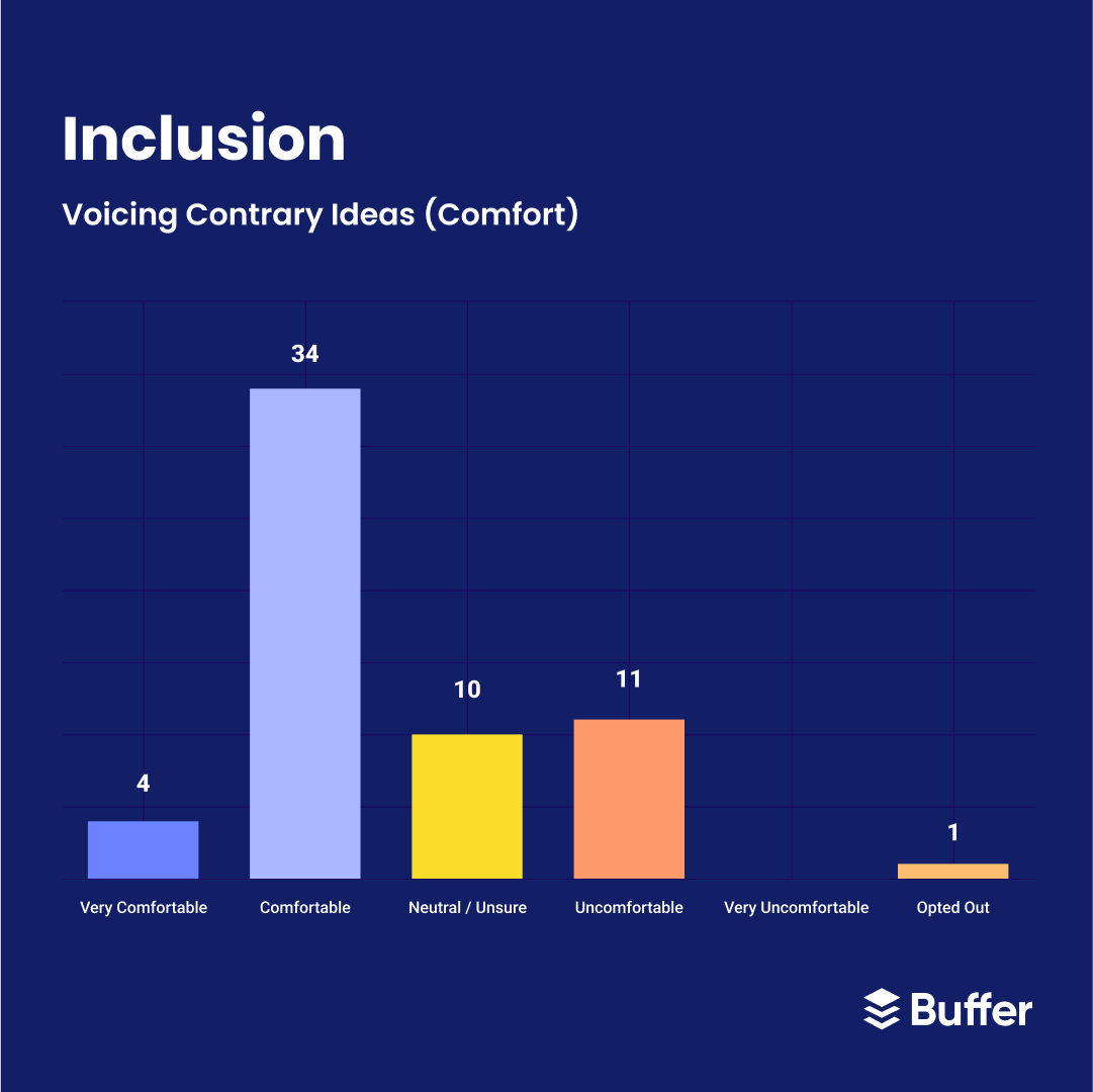 We found that about a third of the team doesn't feel comfortable voicing contrary ideas or discussing DEI related topics. This impacts our teams psychological safety, and can add to challenges around artificial harmony.