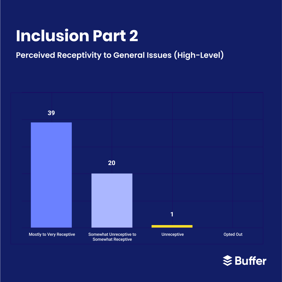 Since we are just getting started in our DEI journey, we’d love to learn from you! What DEI initiatives have worked well for you? What else can we share about how we’re approaching DEI at Buffer? Send us a tweet to let us know!