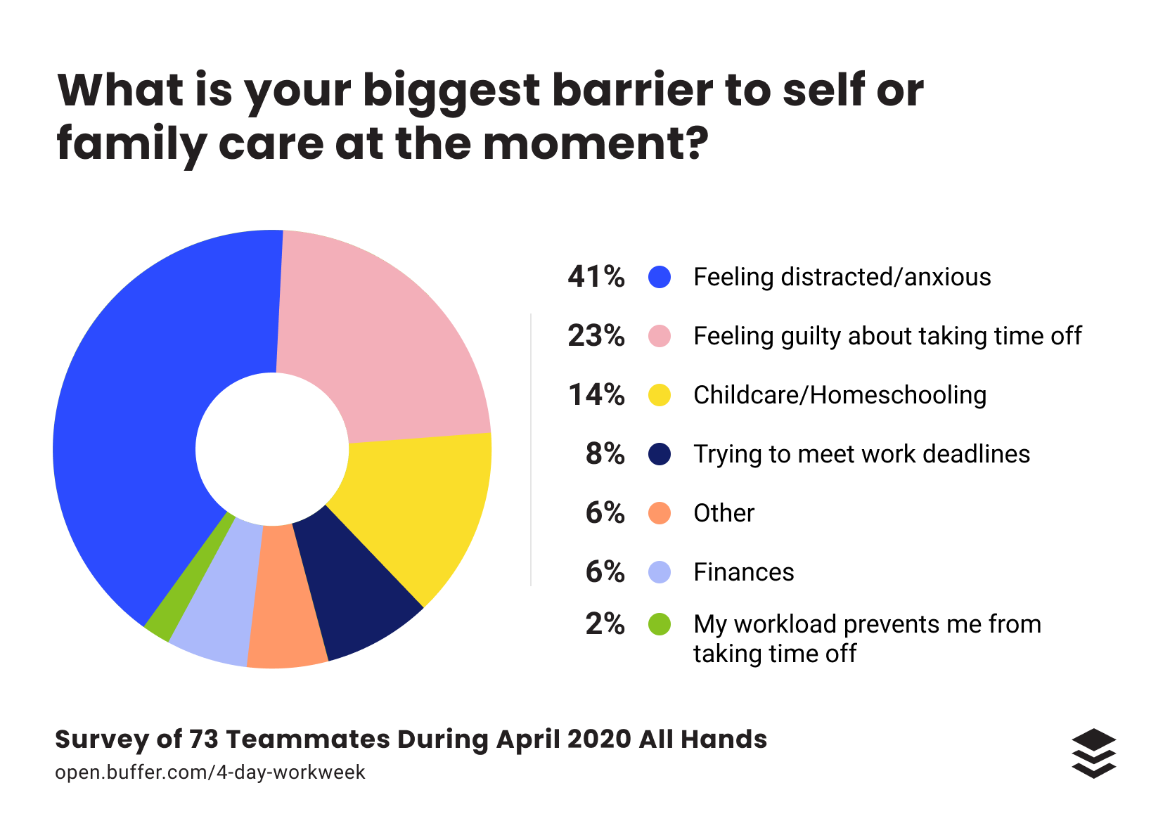 One thing that has been top of mind for us is that this month of trying a 4-day workweek isn’t about pushing everyone’s anxiety or distraction into a single day and expecting the other workdays to be “back to normal.” We know many Buffer teammates will still have caregiving and other responsibilities on some or all of the working days, and flexibility is still supported and encouraged. This day off is to augment that flexibility and give everyone a coordinated break where they won’t feel like they’re behind or catching up when they return.