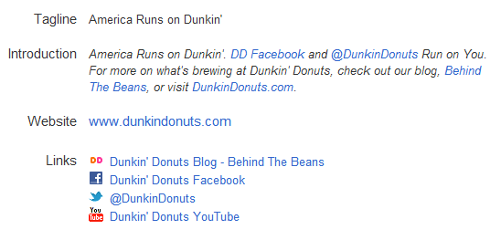 For example, Dunkin Donuts’ Google+ profile contains links to all of their other social networks.