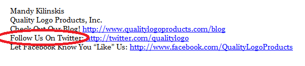 Who better to follow you than your current customers and fans? Adding a line to your signature that says “Find me on Twitter” (or even better “Follow me on Twitter”) and including a URL to your account saves your recipients the step of looking it up. They simply click and they’re there!