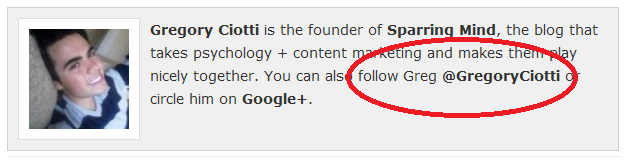 Gregory Ciotti, and all of us that write guest posts for Buffer, put our Twitter handle in our author bio.