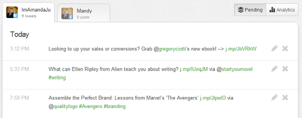 With an 8-5 job, I don’t have the time (or access) to log onto Twitter every few hours and share an article I read at 7 am. So with tools like Hootsuite, TweetDeck, and my personal favorite, Buffer (pictured above), I can schedule my social media presence in the morning and don’t have to think about it the rest of the day.