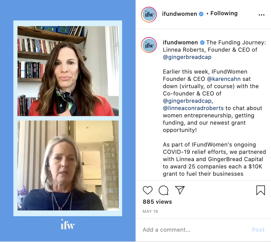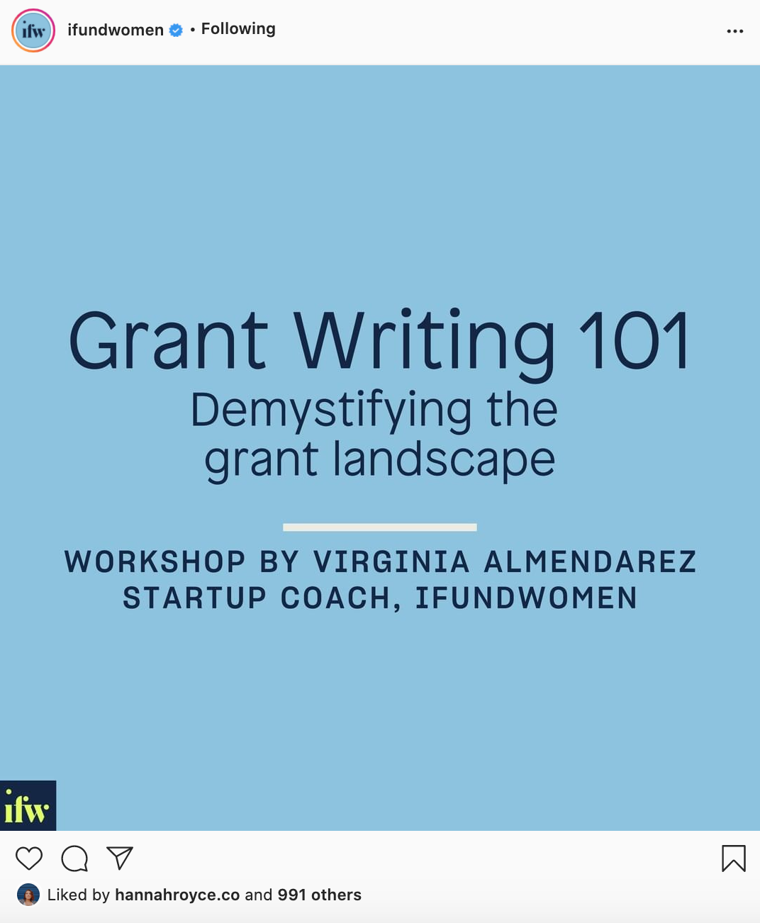 For example, IFundWomen partners with companies to build grant programs for businesses. Over the summer, during the application window for one of our grants people were consistently sliding in our DMs asking very specific questions about their grant application. We decided to host a workshop specifically on grant writing. To promote this free workshop I seriously just took a screenshot of the first slide of the presentation that was going to be used for the workshop. The post blew up with nearly 1000 likes and over 400 people registered for the workshop. I think it succeeded because the Instagram post was very simple, straight to the point, and directly addressed a concern our community was having.