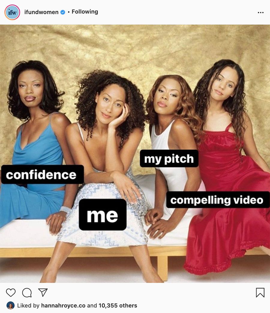 I spend a lot of time scrolling through Instagram to get inspo for social content. I am always stalking Ellevest, R29 Unbothered, Freelancing Females, Girlboss, the list goes on. Additionally, our community is #TeamMemes so pop culture inspires a good amount of my content. I am also looking for the next thing to be memeified! For example, millennials collectively are re-watching the early 2000s sitcom Girlfriends on Netflix. Everyone is talking about it, so I made a meme from a picture of the cast to promote one of our grant programs.