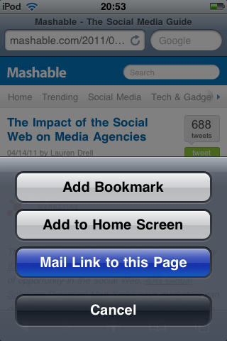 2.) Hit “Mail Link to this Page” or similar. On the iPhone, this is in the menu when you tap “+”. Your mobile will automatically put the title of the post in the subject and the link to it in the body of your email. That’s perfect.
