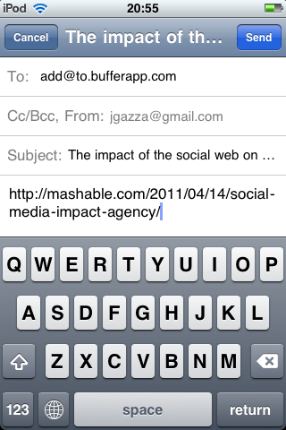 (It’s super simple. Just send an email to: add@to.bufferapp.com, where the subject is your tweet and the link you want in your tweet is in the body.)