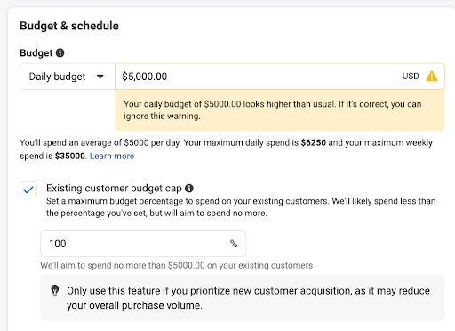 One other thing you can control with Advantage+ shopping campaigns is what percentage of your ad spend you want to go to new versus existing customers.