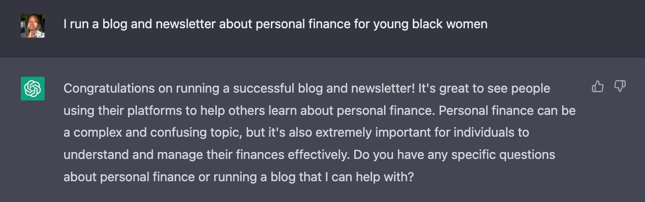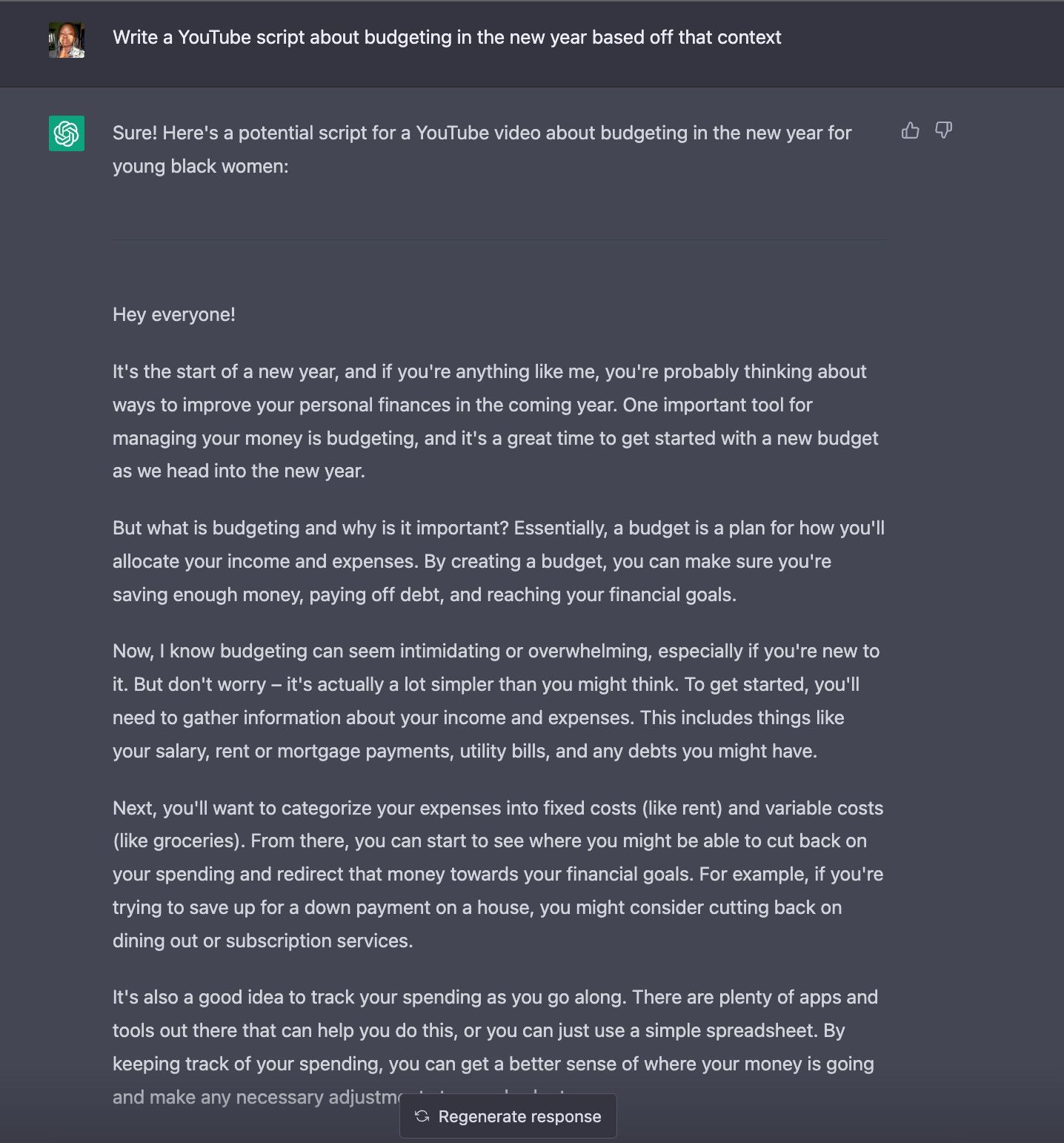 Lately, when I need ideas for a piece of content, no matter what it is, I turn to ChatGPT or Lex. A great way to kickstart playing around with these tools for idea generation is to give a bit of context: “I write a newsletter/blog/run a Twitter account about X topics.” Then give your prompt: “Write a Twitter thread about X” or “Write a YouTube script about Y.”