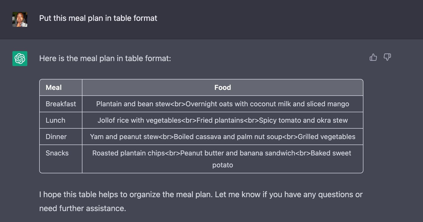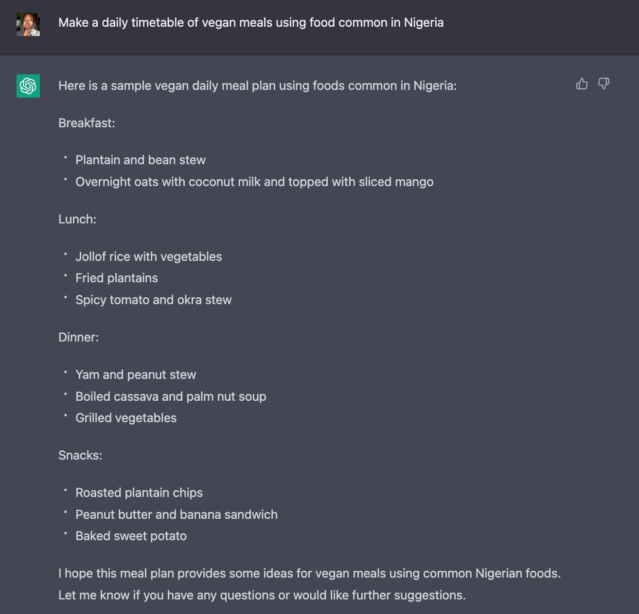 For example, I asked ChatGPT to create a vegan meal plan using food commonly available in Nigeria, where I live. Putting together a table like this might have taken me a few hours of research and refining, but I got it in a few seconds with a few tweaks to my prompts. Whether I’ll actually follow it or not is between ChatGPT and me.