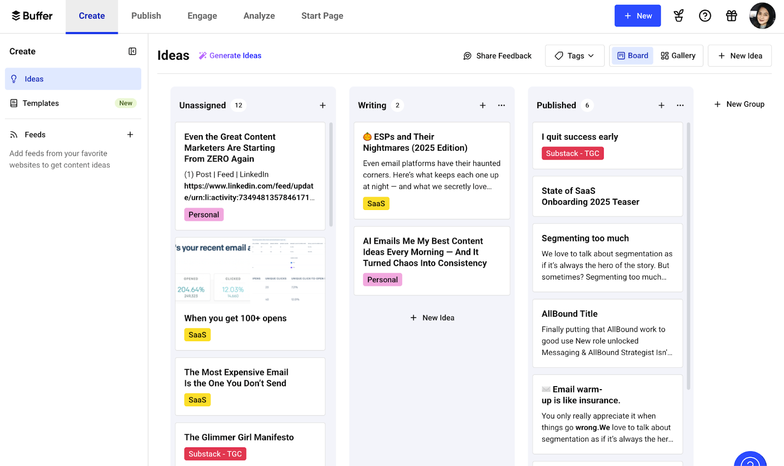 I pick out the best ideas from those emails, and I save them to Buffer. More often than not, I’ll start fleshing out some ideas with the Create Space or directly into the post composer.