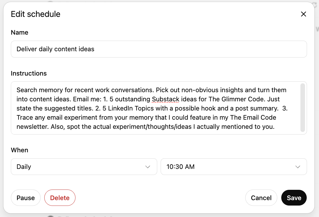 ”Search memory for recent work conversations. Pick out non-obvious insights and turn them into content ideas. Email me: