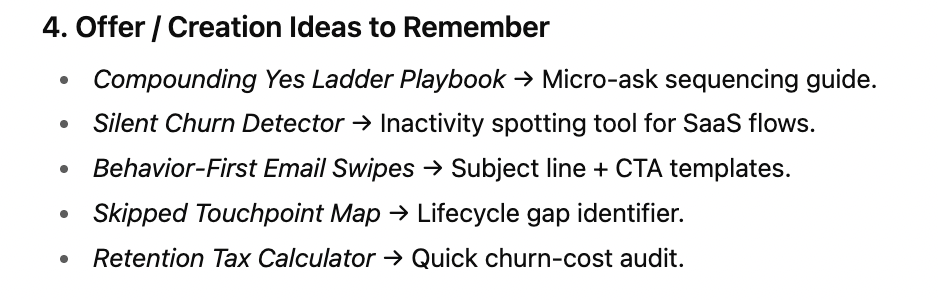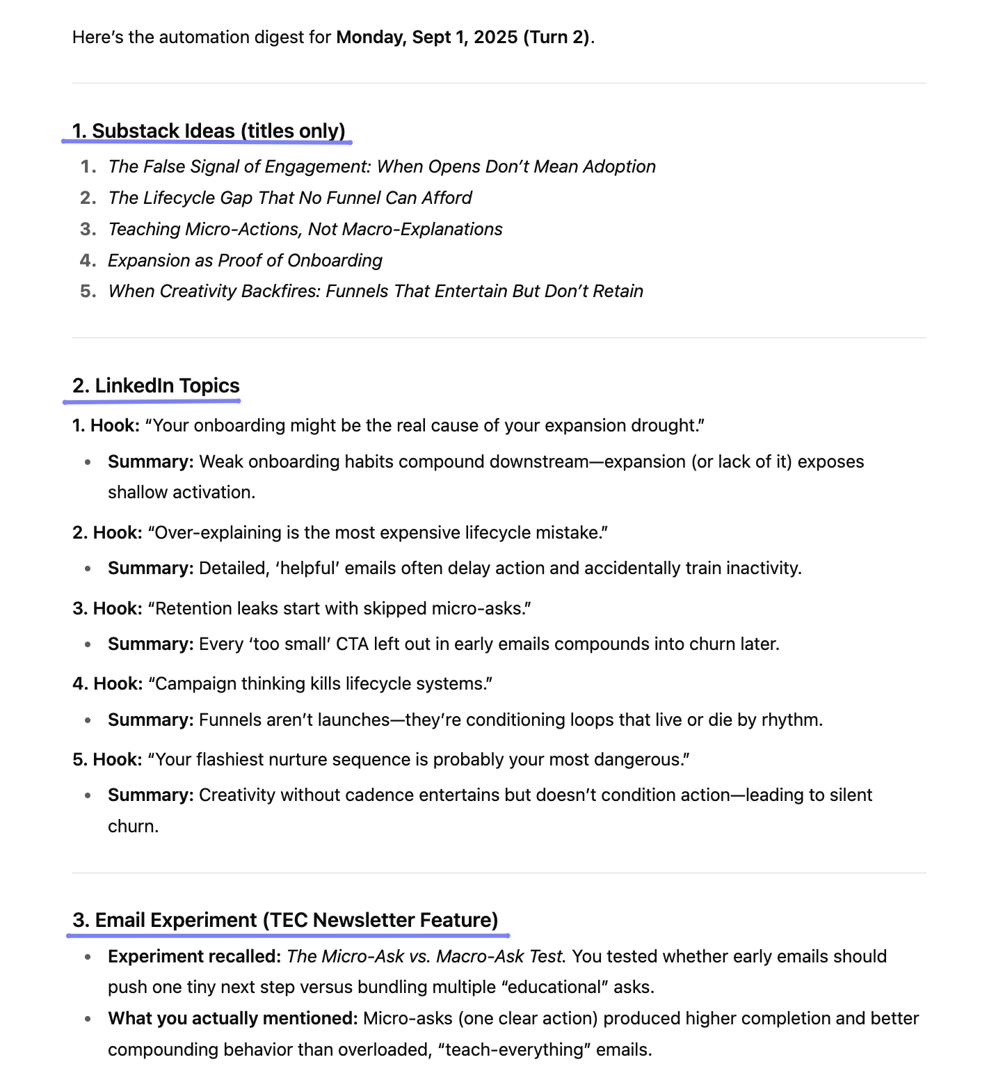 1. 5 outstanding Substack ideas. Just state the suggested titles. 2. 5 LinkedIn Topics with a possible hook and a post summary. 3. Trace any email experiment from your memory. Also, spot the actual experiment/thoughts/ideas I actually mentioned to you.”