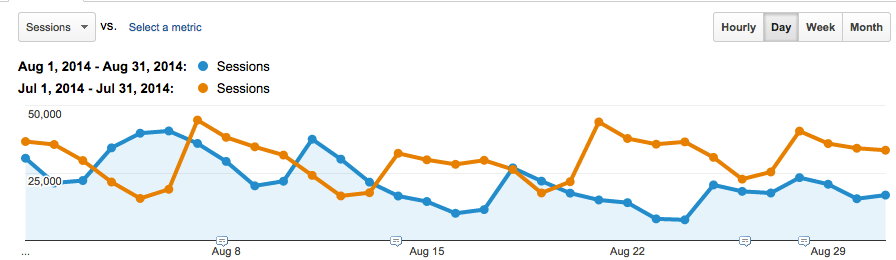 Here’s what our traffic looked like in August (in blue) compared to July (in yellow).