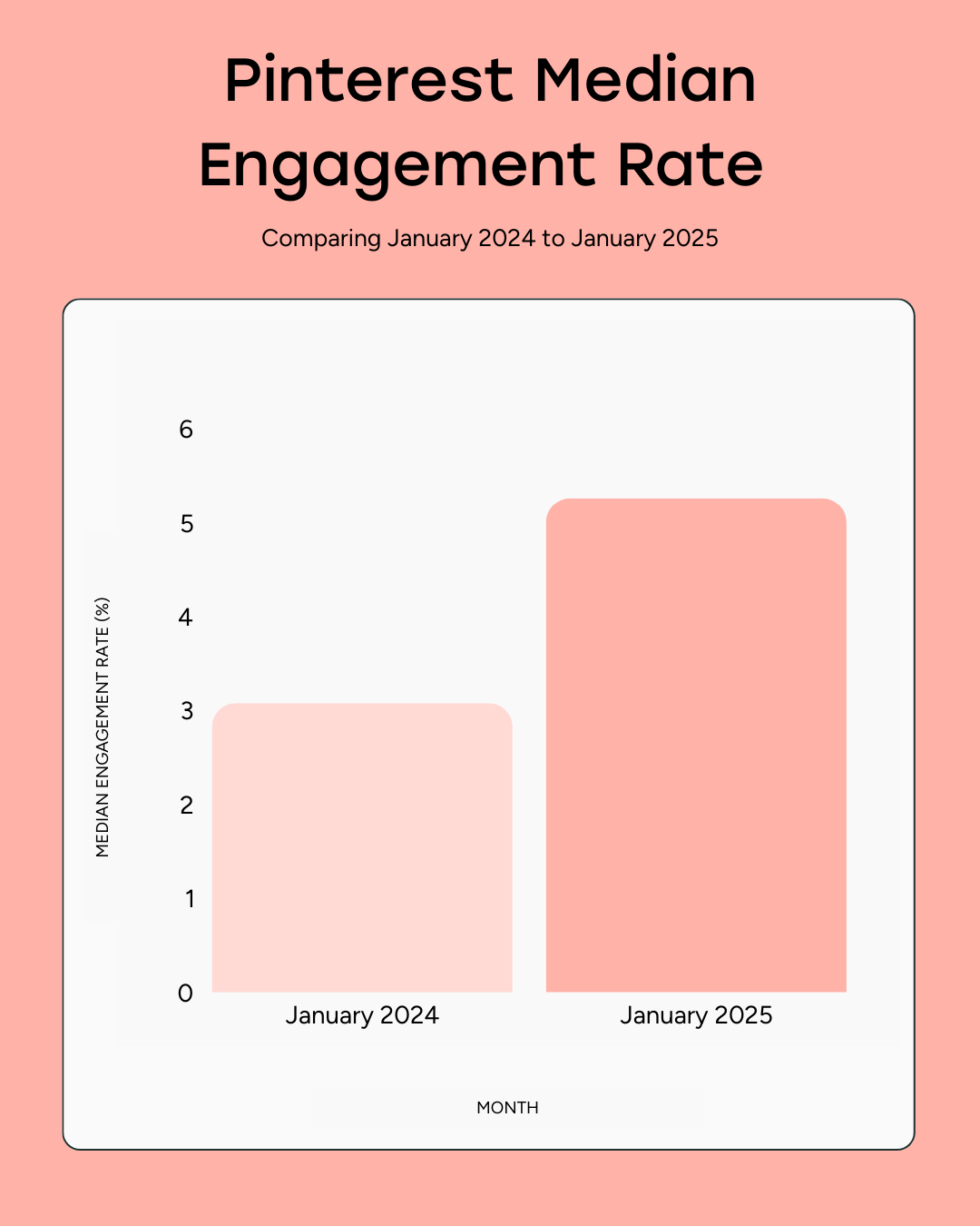Pinterest engagement has grown from 3.08% in January 2024 to 5.26% in January 2025, making it one of the strongest platforms for long-term engagement.