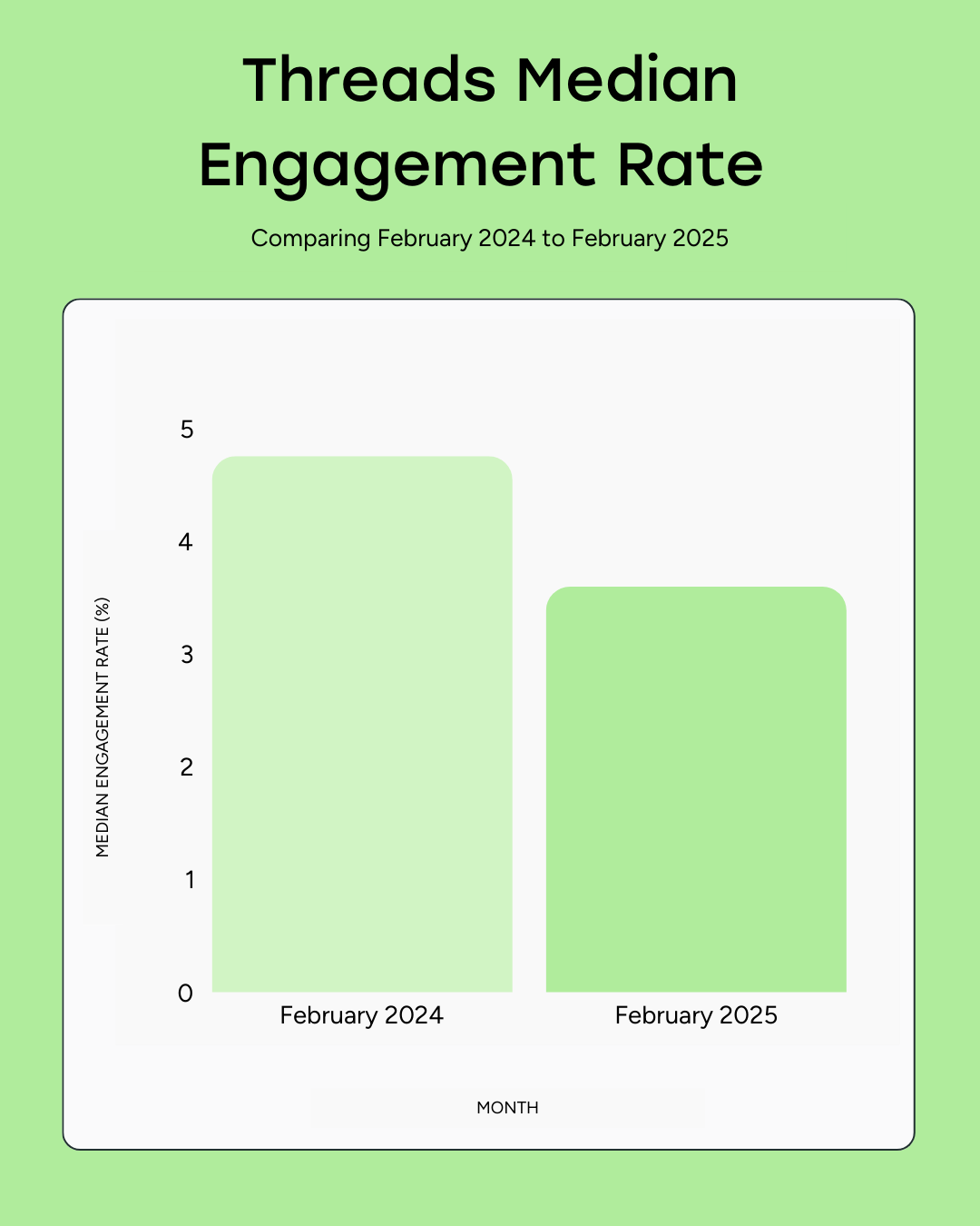 Threads launched with high engagement, but its numbers have steadily declined from 4.76% in February 2024 to 3.60% in February 2025. While Threads still outperforms X/Twitter in engagement rate, its growth phase has leveled out.