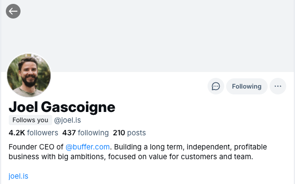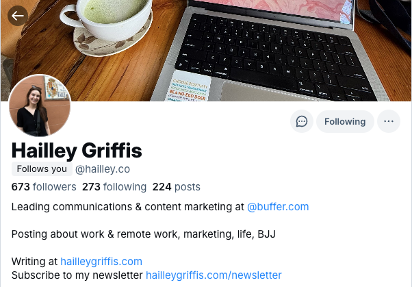 Buffer’s Joel Gascoigne (@joel.is) and Hailley Griffis (@hailley.co) have gone this route — notice how neat their handles are.