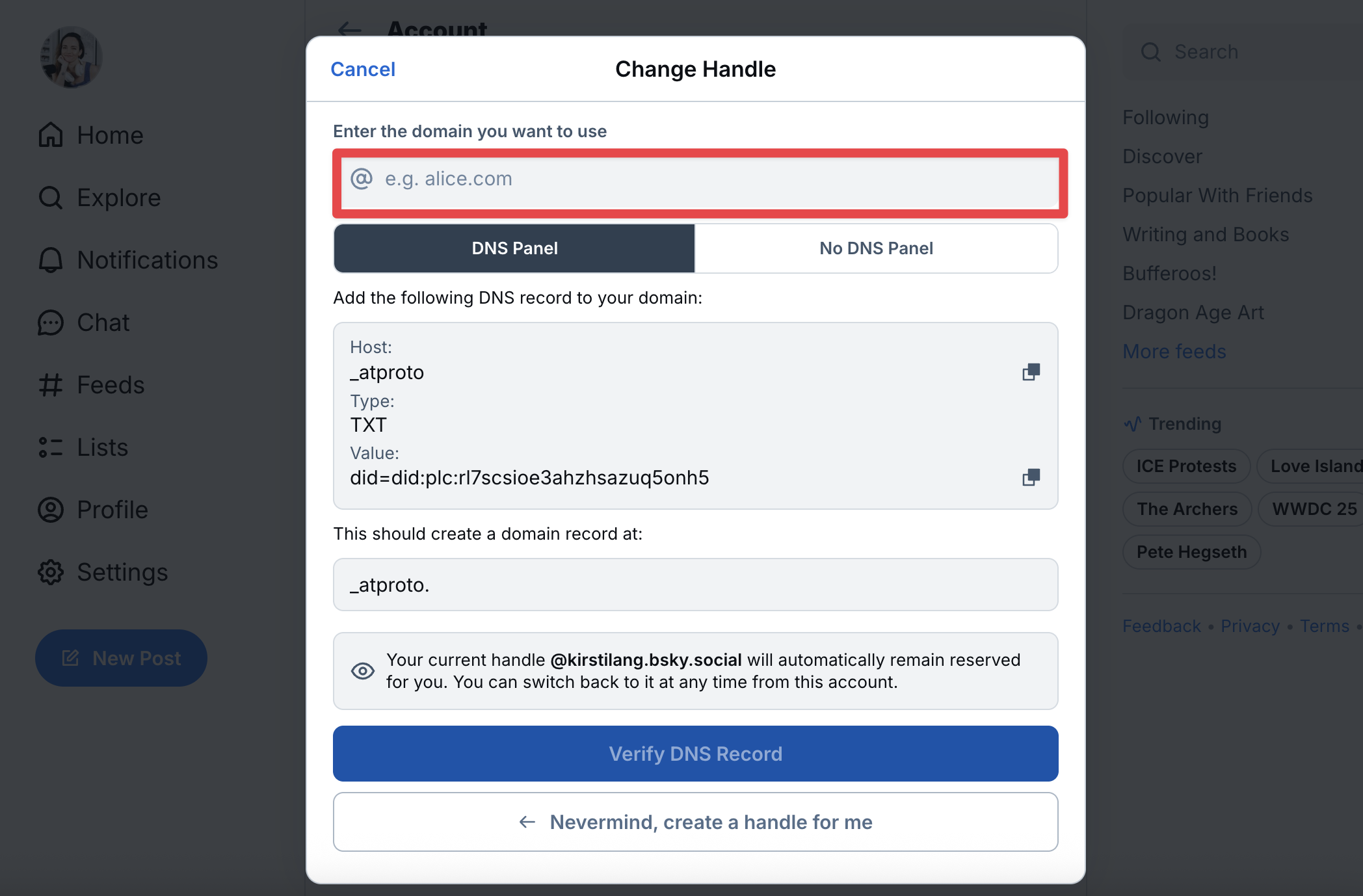- Return to Bluesky and tap the ‘Verify DNS record’ button. Once confirmed, click Update to your new domain-based handle.