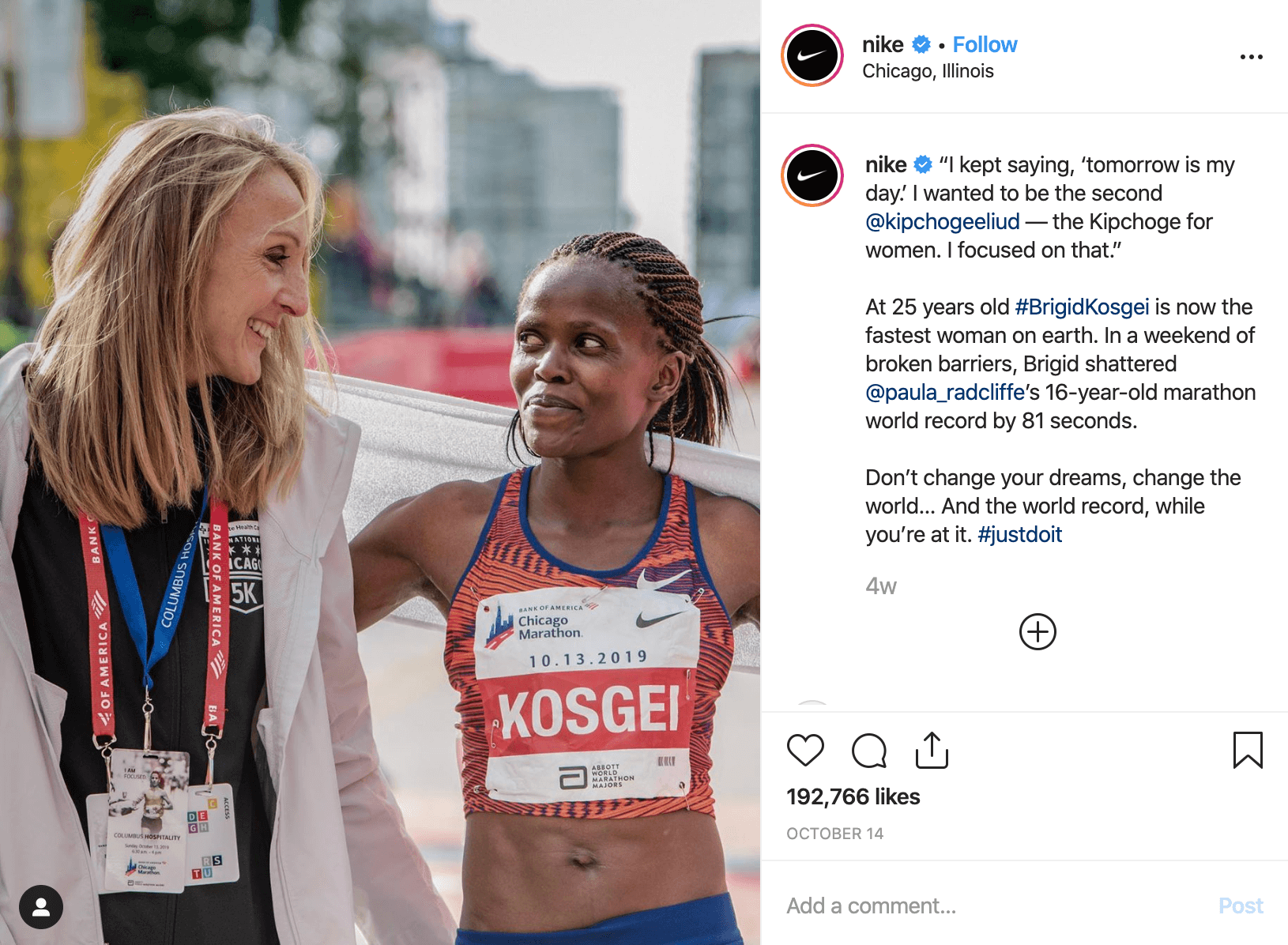 Nike’s brand is reflected in every piece of content it puts out on social media. Just before writing this, I jumped over to Nike’s main Instagram account, here are just a few posts I spotted: