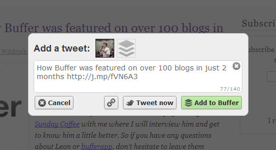 We have another feature ready for you. From now on you can “Tweet Now” via Buffer with both the browser extensions and from your home account. Here’s how it looks: