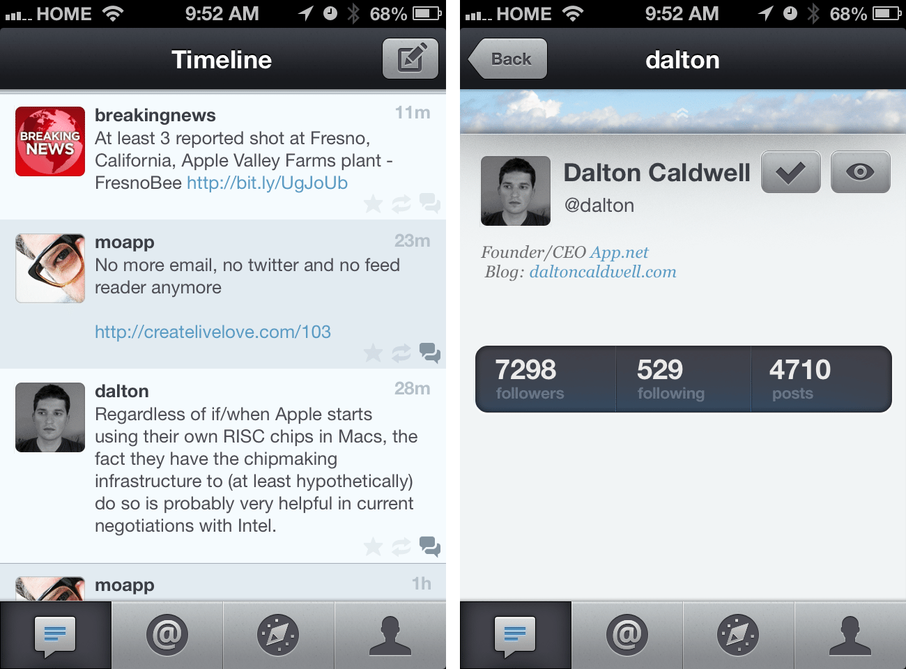 One of the best things that has come of it are awesome iPhone and iPad clients, one of them being a cool new app called Rhino. It gives you a super fast and gorgeous interface to follow your App.net posts, is completely free and comes with lots more details: