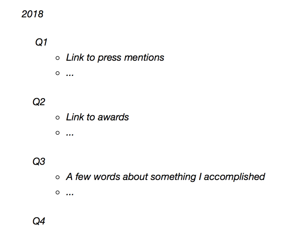 I have this in one list with section titles for the year as well as the quarter. Quarterly is how I like to break it up, but you can create your list however you’d like. If you do performance reviews twice a year, for example, then it might make more sense to make this list into 6-month blocks.