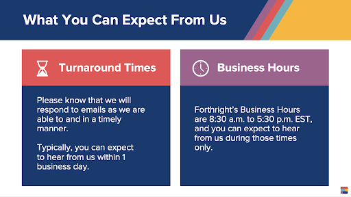 In every proposal for a new client or project, we include a rate card that outlines the client’s standard rate and their outside-of-business-hours rate. We also use this as an opportunity to outline what our business hours are and what clients can generally expect in terms of responsiveness both during and after business hours. During the account kickoff with a new client, we reiterate these working norms again.