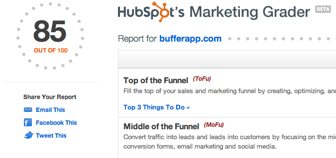 Then, Marketing Grader will examine the Middle of the Funnel. Here the focus is more on which tactics you can use for converting visitors. The report looks whether you provide forms, email signup or subscribe buttons and whether you are missing out on any call to action opportunities.