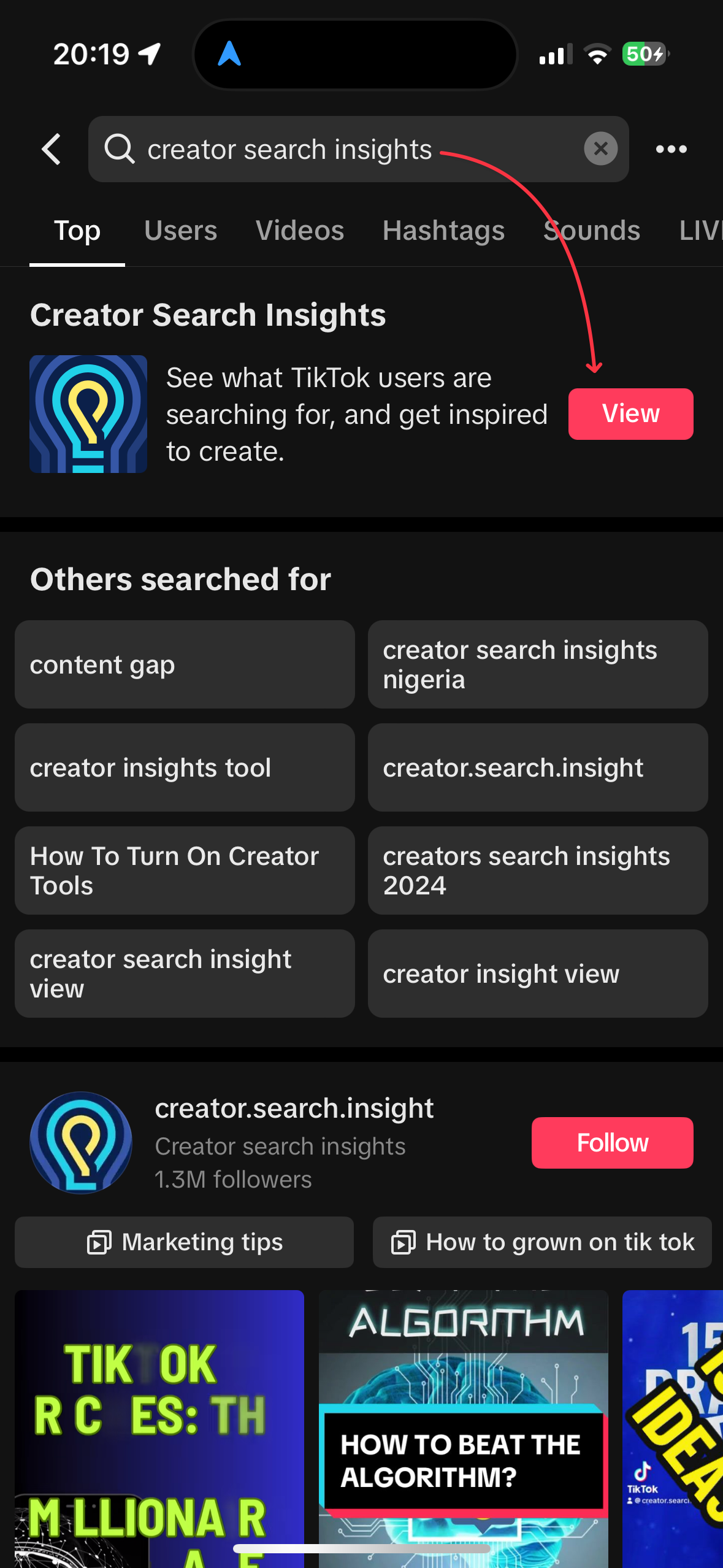 To get started using TikTok Creator Search Insights, simply enter the term “creator search insights” into the search bar and tap View.