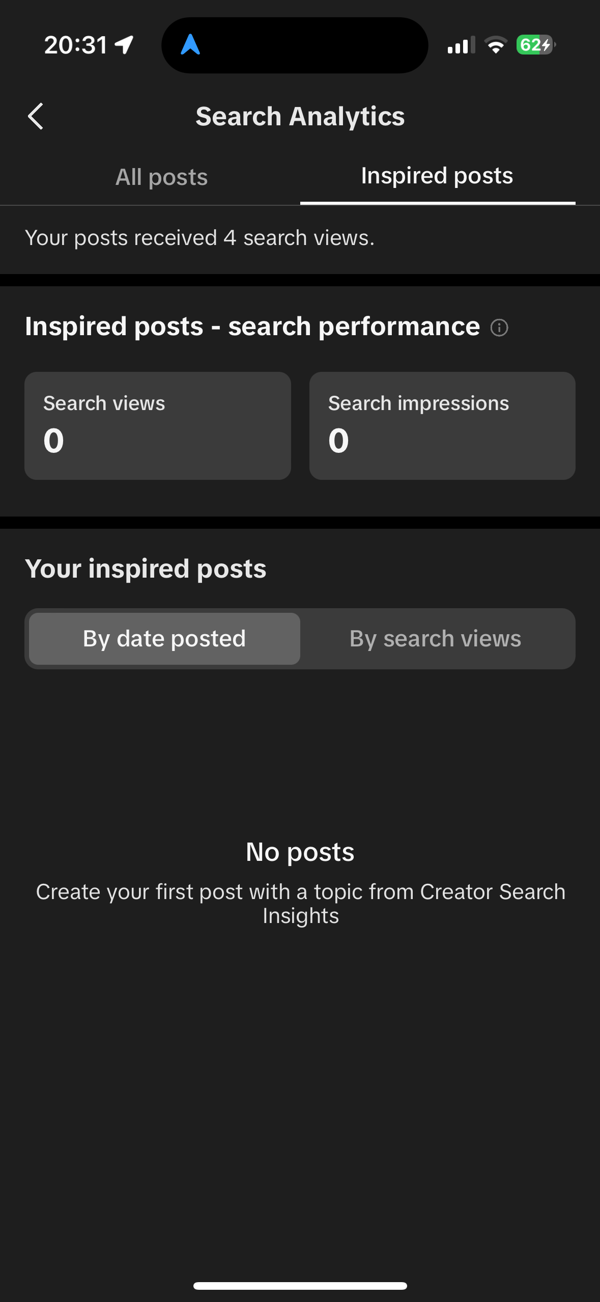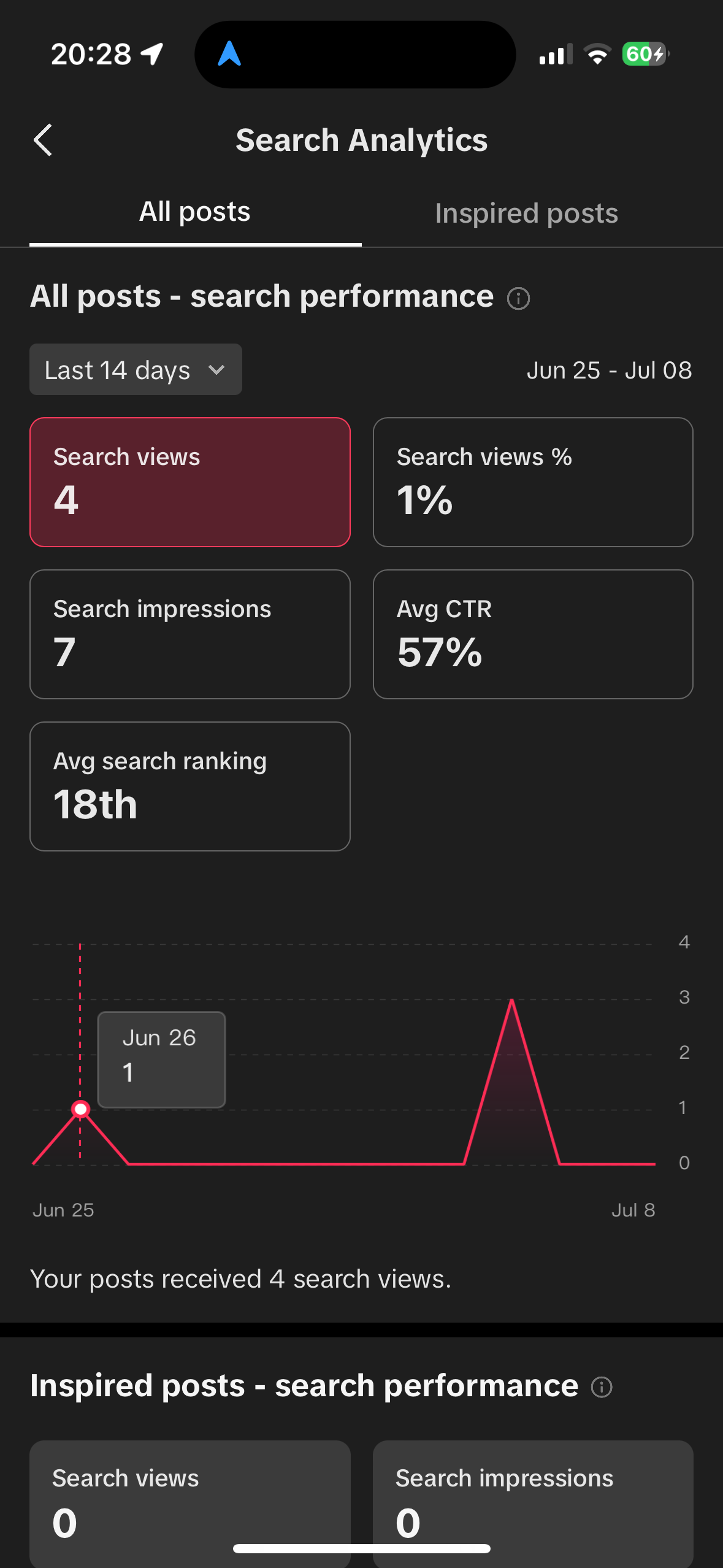 Additionally, you can access Search Analytics and then Inspired posts, to see how your posts – specifically the ones you’ve created by clicking through to the creation area from Search Insights – are performing. You can also see how your overall content is performing in TikTok search.
