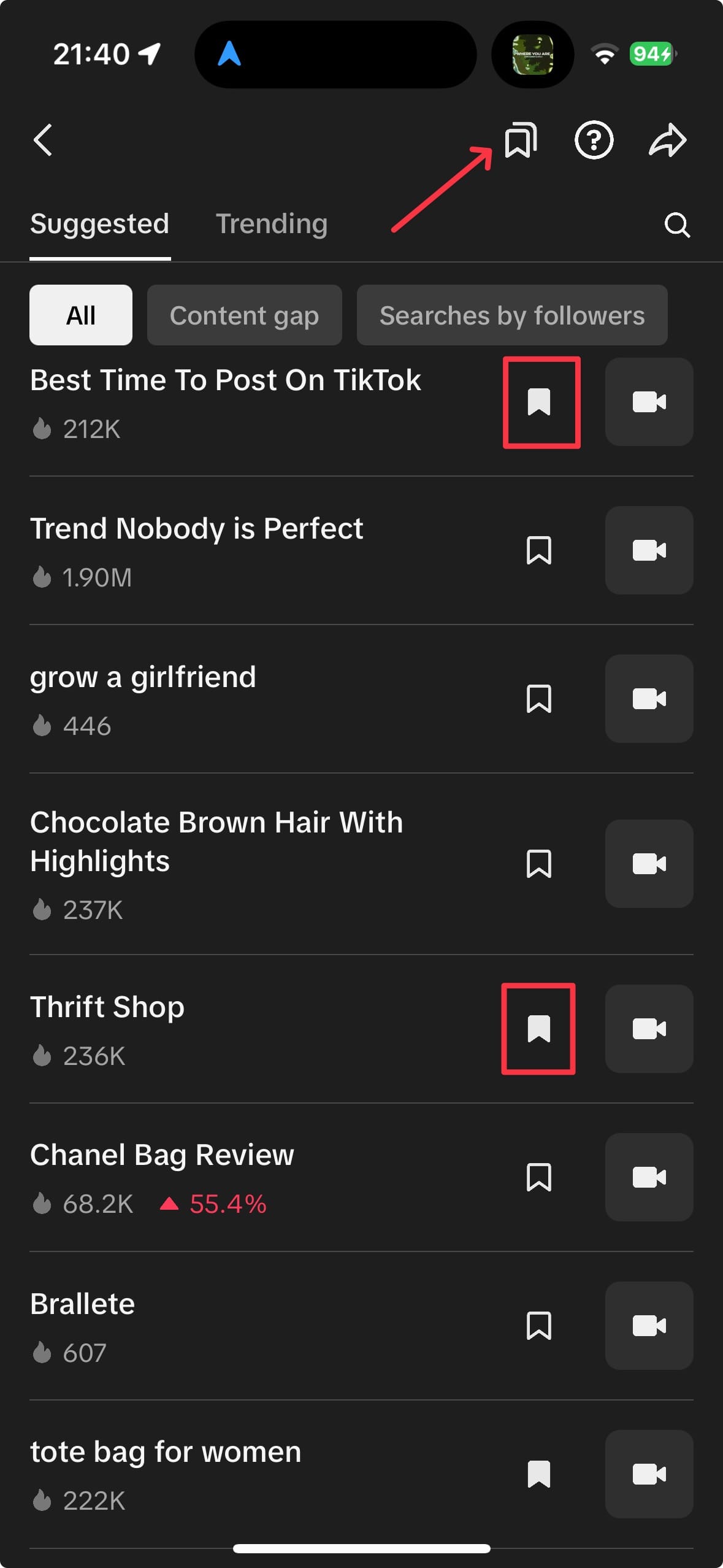 If you’d like to work on content for a particular term later, you can also bookmark it by tapping on the icon in the top right corner of a keyword page. You’ll find all your bookmarks on the homepage of Creator Search Insights, in the top-right corner.