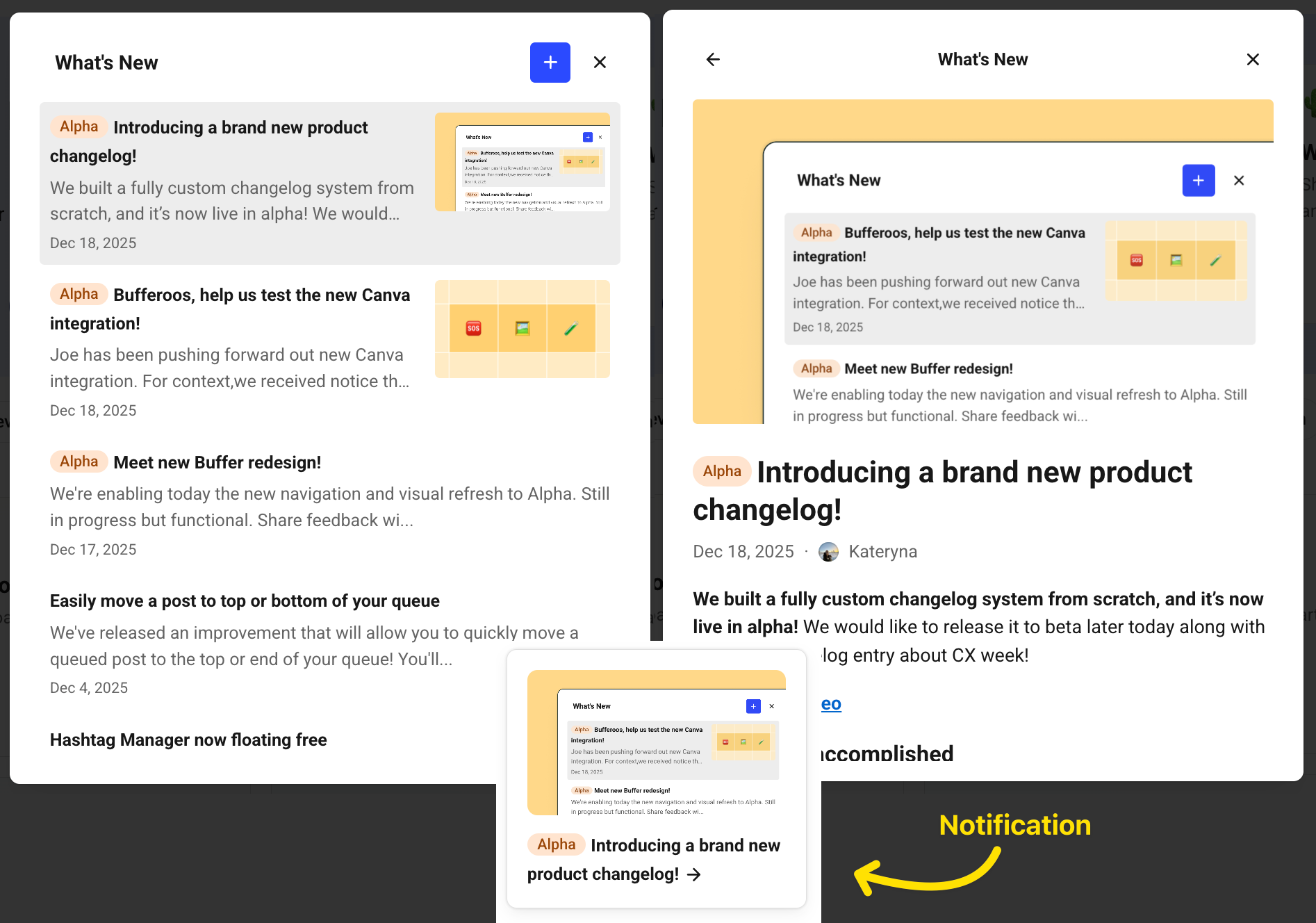 Beyond the tooling itself, the team also established guidelines and templates to keep changelog entries clear, useful, and on-brand — along with a regular cadence for sharing updates. Together, this work strengthens Buffer’s commitment to transparency and helps customers stay informed about how the product is evolving over time.