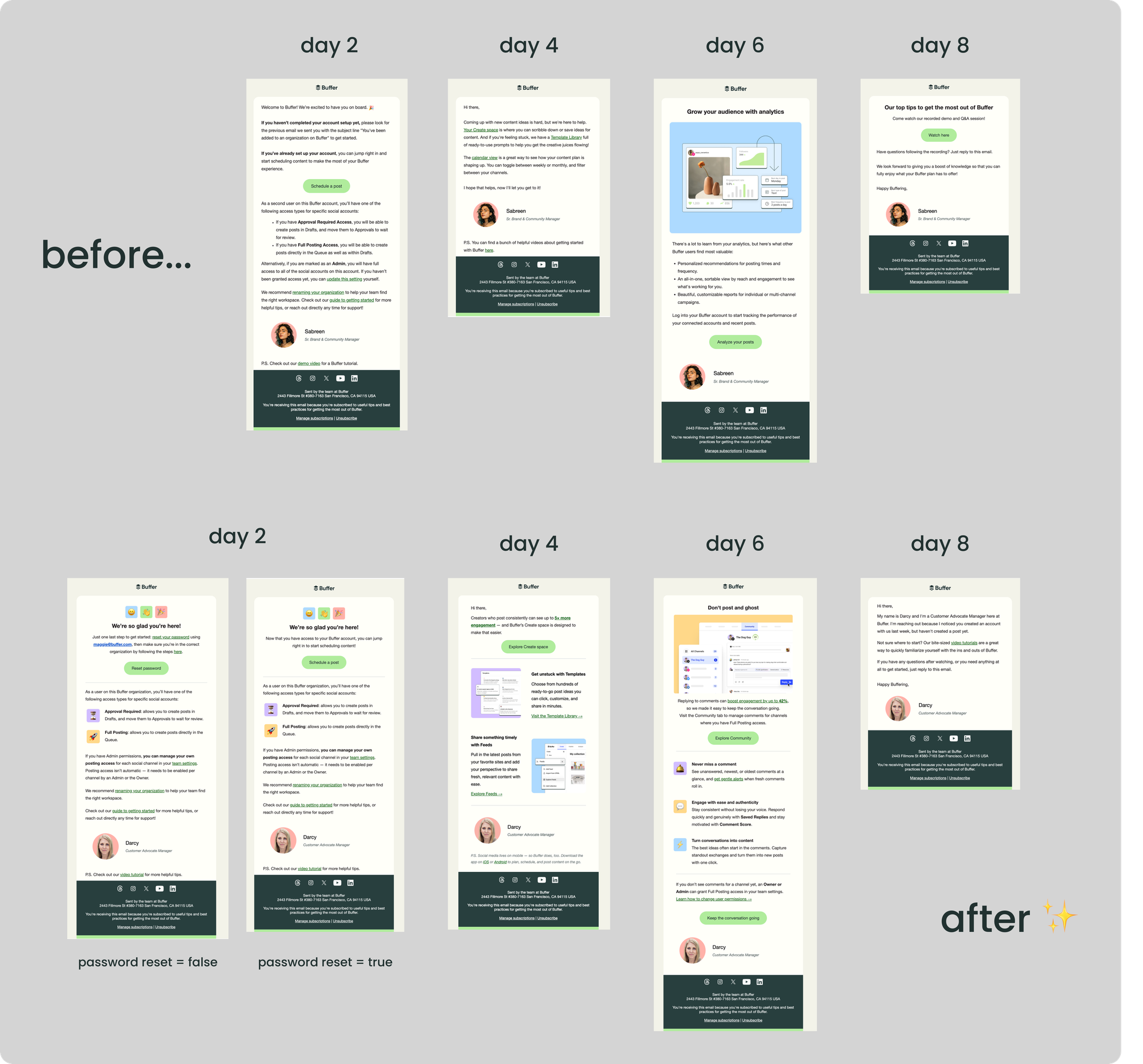The team refreshed the entire team onboarding email series to reduce confusion and improve relevance. The updated flow mirrors Buffer’s Free and Trial onboarding more closely, with a stronger emphasis on habit formation alongside team-specific collaboration features.